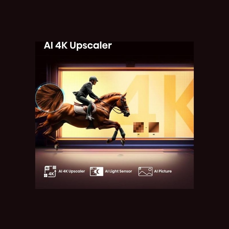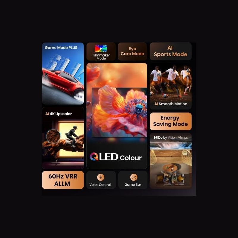 - 4K AI Upscaler/Game Mode Plus/MEMC (Motion Estimation Motion Compensation)/Quantum Dot Colour