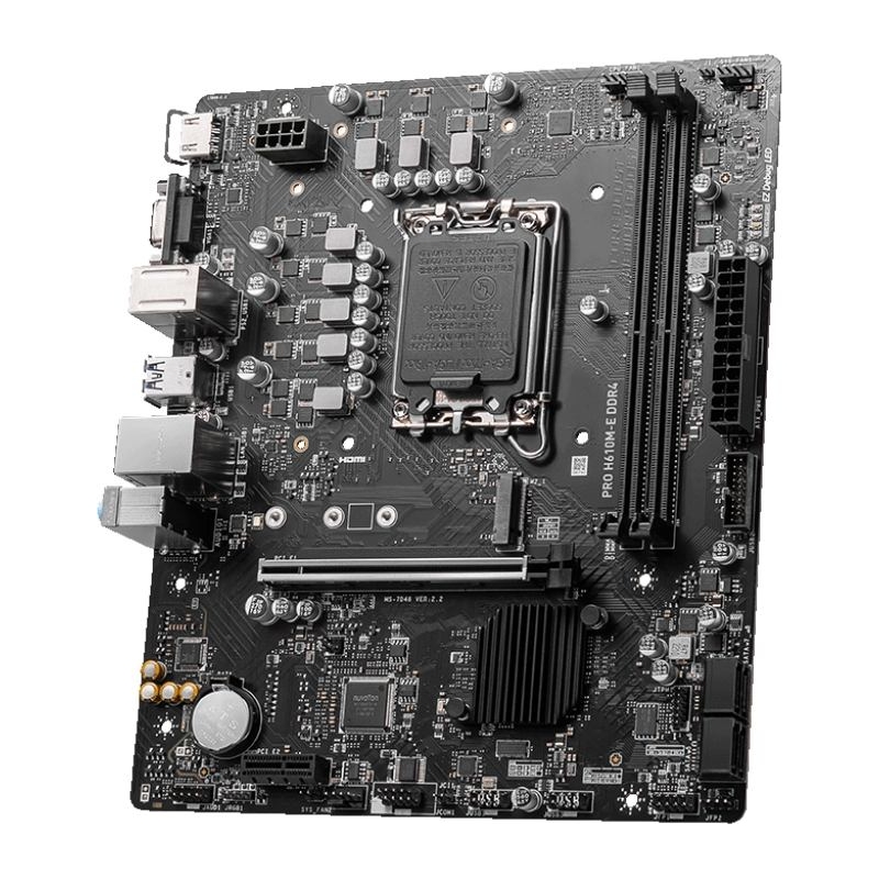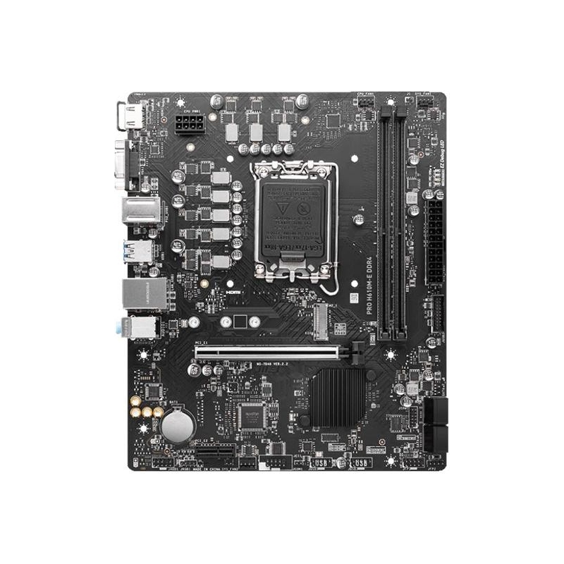 SKU KBMSIIIEH610U01 Barcode 4711377002660 Model Pro H610M-E DDR4 CPU socket LGA1700 Processor family Intel Celeron Processor family Intel Pentium Processor family Intel Core Integrated CPU No Chipset manufacturer Intel Chipset type Intel H610 Chipset Memory type DDR4 Number of DDR4 slots 2 Memory bus frequency 3200 MHz Memory bus frequency 2666 MHz Memory bus frequency 2133 MHz Max memory size 64 Expansion slots 1 x PCIe 4.0 x 16 Expansion slots 1 x PCIe 3.0 x 1 Max. number of SATA devices 4 RAID No Graphics 1x HDMI 1.4 with HDR port, supporting a maximum resolution of 4K 30Hz 1x VGA port supporting maximum resolution of 2048x1536 50Hz, 2048x1280 60Hz, 1920x1200 60Hz Sound card Realtek ALC897 Codec 7.1-Channel High Definition Audio Network interface 1x Realtek RTL8111H 1Gbps LAN controller USB ports at back panel 6 USB ports on motherboard 6 Number of USB 3.0/USB 3.1 gen 1/USB 3.2 gen 1 ports 4 FireWire (IEEE 1394) No COM connector / port No LPT connector / port No External connectors 1 x PS/2 Keyboard/MouseCombo External connectors 4 x USB 2.0 External connectors 1 x D-Sub External connectors 1 x HDMI External connectors 1 x Line In External connectors 1 x Line Out External connectors 1 x MIC External connectors 1 x RJ-45 External connectors 2 x USB 3.0 Onboard connectors 1 x Serial port header Onboard connectors 1 x TPM header Onboard connectors 2 x USB 2.0/1.1 header Onboard connectors 1 x USB 3.0 header Onboard connectors 1 x 8pin 12V power Onboard connectors 1 x 24pin ATX zasilanie Onboard connectors 1 x 4pin CPU fan Onboard connectors 2 x System panel header Onboard connectors 1 x Front panel audio header Onboard connectors 1 x Clear CMOS jumper Form factor micro ATX Dimensions 23.6 x 20 cm Supported operating systems Windows 10 Supported operating systems Windows 11 Designation CE+WEEE
