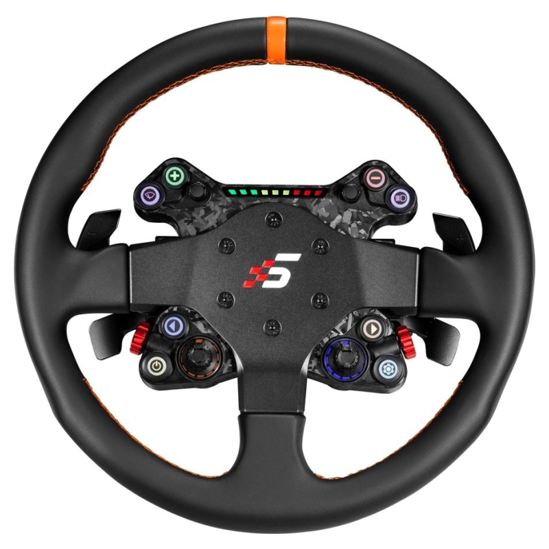 Quick Release 50mm SimPro Manager Leather Coating Carbon Fiber Plate 2 x 7-way Multi-position Switch Round Rim Customizable Paddle Modules 2 x 12-Set Programmable LED Encoders 2 x Thumb Knob Encoders Aluminum Frame