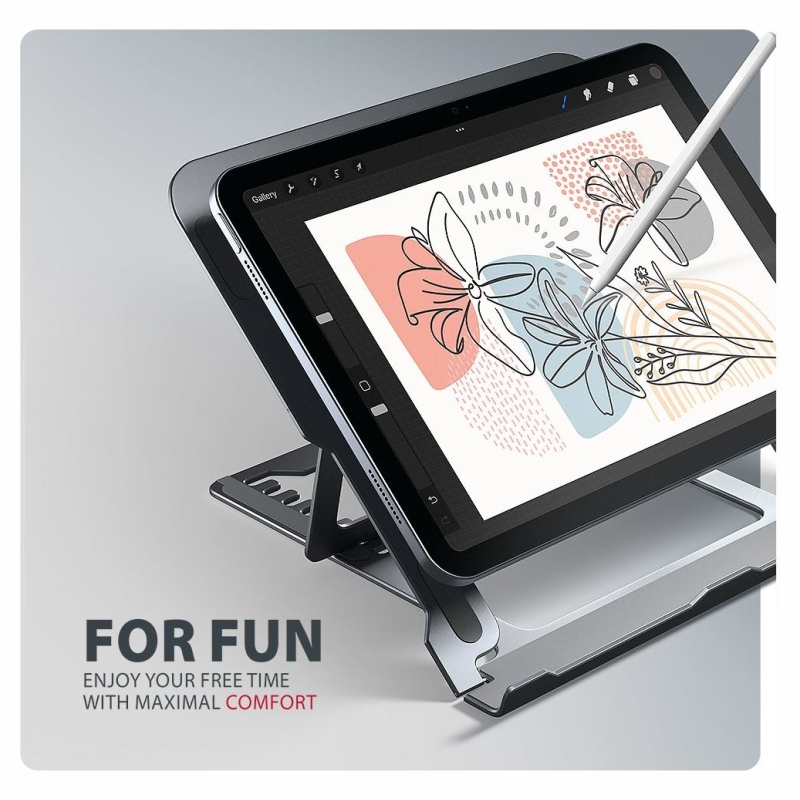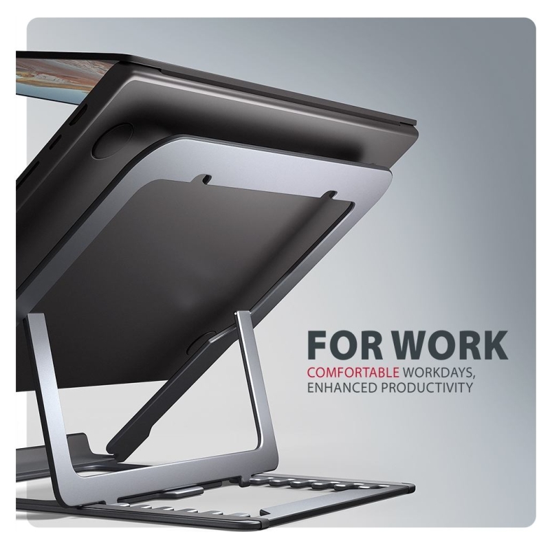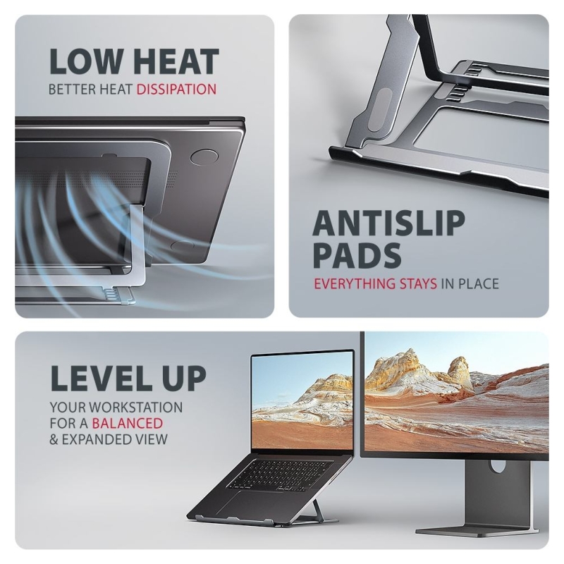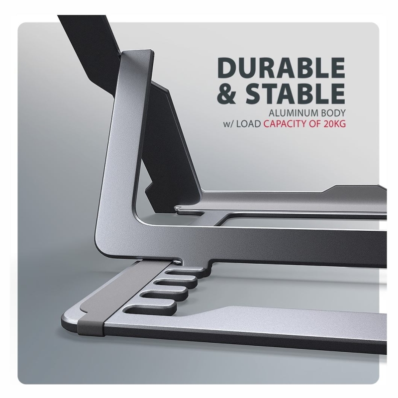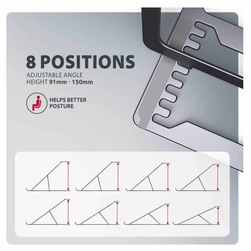 AXAGON STND-LAG is a stand for a laptop or tablet, which ensures comfort and improves ergonomics at work. It is ideal for devices with a screen from 10" to 17.3" and allows adjustment to up to eight positions. This makes it easy to find the ideal stand inclination for maximum relaxation of your neck and back muscles. Enjoy a comfortable working environment with a compact and portable stand that adapts perfectly to your needs whether you're working at home, in the office or on the go. The base is made of aluminium castings guaranteeing long life and reliability. Thanks to the non-slip finish, you don't have to worry about unwanted movements – your device stays firmly in place without damaging the surface of the laptop or the pad. These carefully designed features ensure perfect stability for your laptop, tablet or even your favourite book, giving you peace of mind and comfort during everyday use. A great advantage is the ability to adjust the stand to up to eight positions. This allows you to raise the laptop to a height from 91 to 150 mm. This gives you an additional work place at the correct eye level, which greatly improves ergonomics and comfort at work, while increasing your productivity. The stand can be easily folded into a compact size, making it convenient to carry wherever you need to go. Its elegant grey design not only complements your desk in style, but also brings practical features you'll appreciate in everyday use. The design ensures optimal heat dissipation from your laptop, thereby improving its performance and extending its service life.