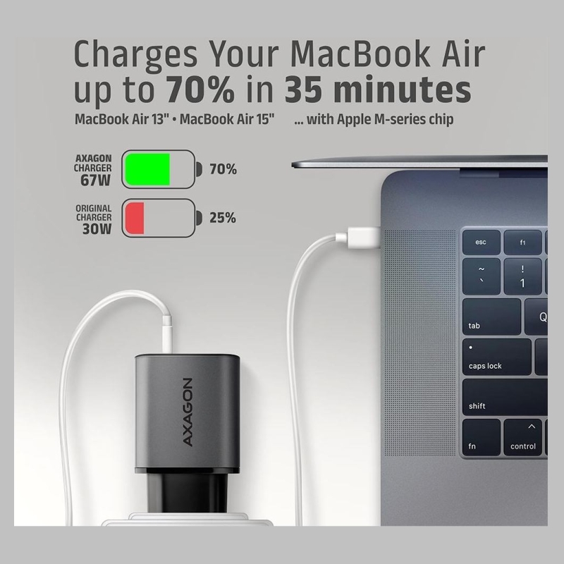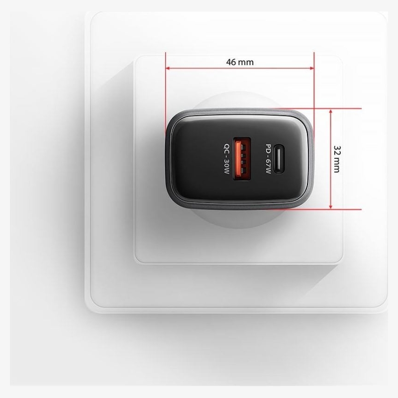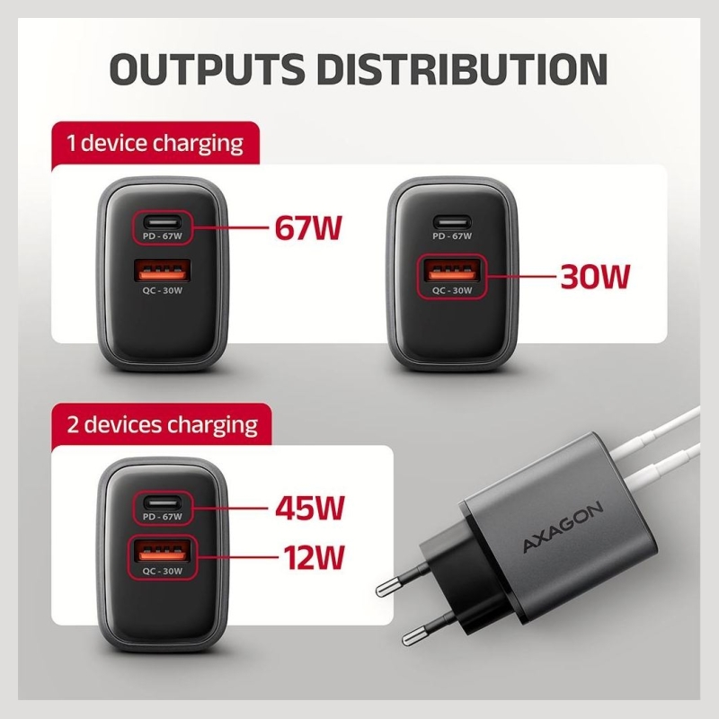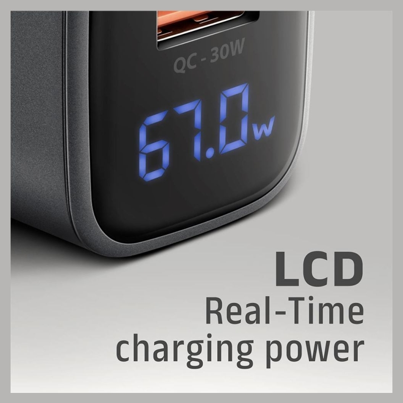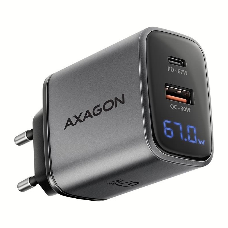 Travel wall charger AXAGON ACU-PQ67D GaN enables fast charging of up to two mobile devices simultaneously. With 67W of total power, the charger can charge laptops, tablets, phones, and other mobile devices at the highest possible speed. The adapter offers not only a standard USB-A connector, but also a reversible USB-C connector. The clear LCD display shows the current charging power.
