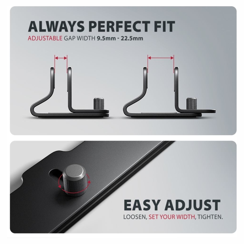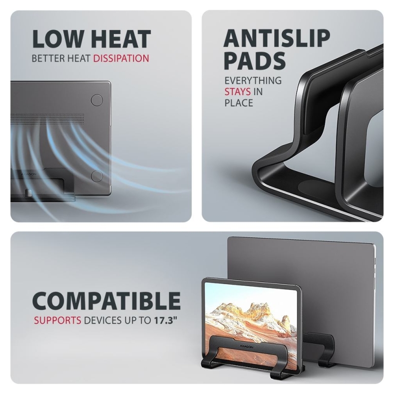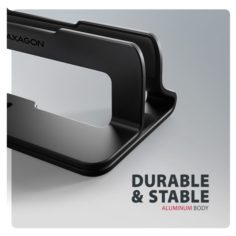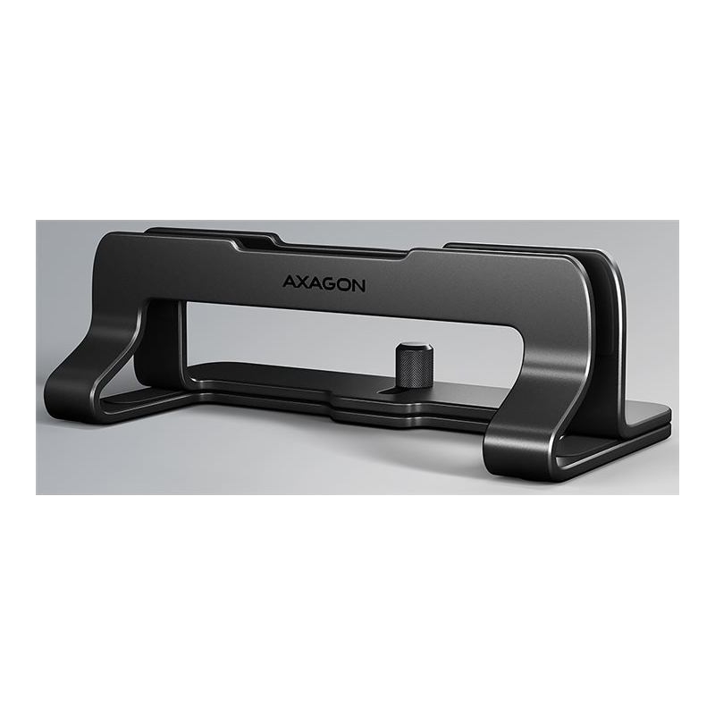AXAGON STND-VB is an elegant and practical stand for a laptop or tablet that allows vertical placement of the device, helping to keep your workspace organized and free up more desk space. It is suitable for devices with a screen size from 10" to 17.3". The compact and easily portable design ensures convenient use at home, in the office or on the go. An advantage is the adjustable slot width from 9.5 mm to 25.5 mm, allowing easy insertion of most laptops. The set width is securely held by a knurled adjustment screw, which firmly locks the stand in the desired position. The base is made of aluminium castings guaranteeing long life and reliability. Thanks to the non-slip finish, you don't have to worry about unwanted movements – your device stays firmly in place without damaging the surface of the laptop or the pad. These carefully designed features ensure perfect stability for your laptop giving you peace of mind and comfort during everyday use. The compact size of the stand allows easy carrying wherever you need it. Its elegant black design not only complements your desk in style, but also brings practical features you'll appreciate in everyday use. The vertical stand provides more space around the notebook’s ventilation openings, ensuring more efficient heat dissipation and helping maintain stable performance as well as a longer device lifespan. At the same time, it keeps the keyboard cleaner and protects the laptop from dust and accidental spills, as the device is raised above the desk surface.