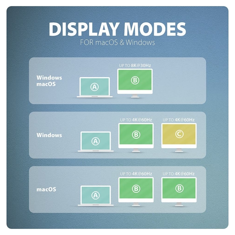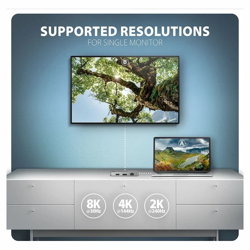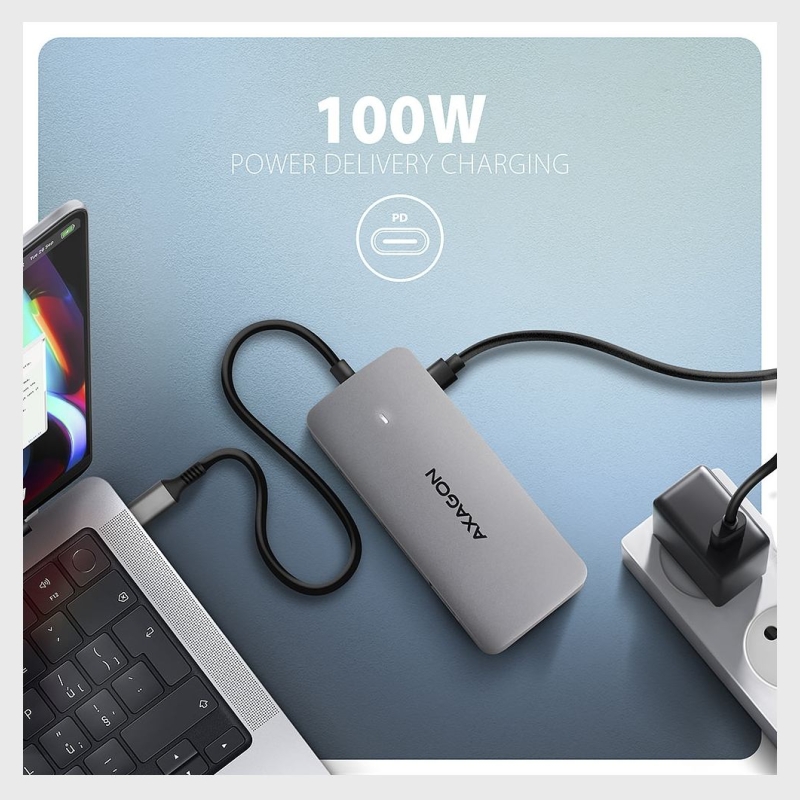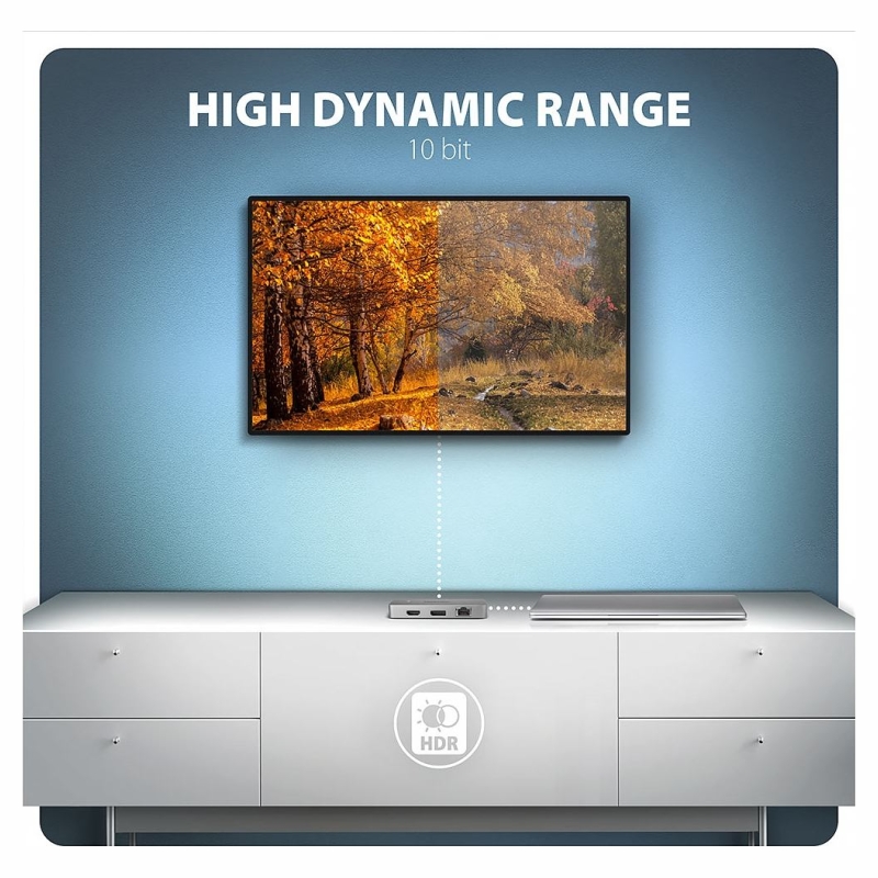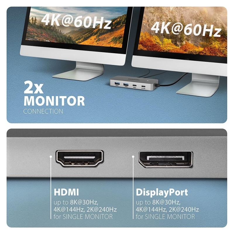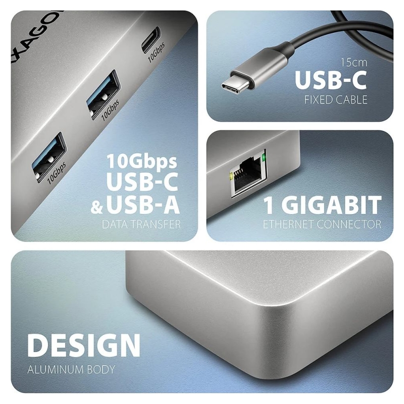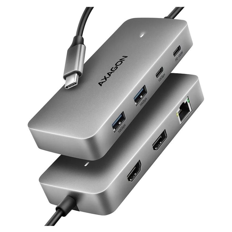 The multi-port USB-C 10Gbps AXAGON HMC-CUB83X2 DUAL 4K DISPLAY 7in1 hub expands your notebook, computer, or phone with two video outputs, a LAN connector, and USB ports. You can connect the notebook to the hub using the 15 cm long USB-C cable. This instantly gives you the option to connect two 4K monitors, three USB devices, and an RJ-45 connector for a Gigabit Ethernet network. At the same time, notebook charging via Power Delivery technology is available. Compatibility with Thunderbolt 3/4/5 provides you with a 7in1 docking station for laptops such as the Apple MacBook Air or Pro. The USB hub offers three USB 10Gbps data outputs, two with standard USB-A and a third with USB-C connector. Thanks to USB 3.2 Gen 2 interface, the hub's transfer rate is up to 10 Gb/s. The hub can also handle permanent connection of several external drives simultaneously. Another USB-C connector is reserved only for charging of phone or laptops using Power Delivery 3.0 technology with a power of up to 100 W. Connect a suitable USB-C Power Delivery charger into the hub and connect the hub to a laptop that supports Power Delivery. This saves one USB-C port. The docking station offers two video outputs – HDMI and DisplayPort allows you to connect external monitors, TVs, or projectors with a resolution of up to 8K/30Hz Ultra HD. Other resolutions are also supported, such as 4K/144Hz Ultra HD, 2K/240Hz Quad HD or 1080p/240Hz Full HD and multichannel audio transmission over HDMI. When two monitors are connected simultaneously, it provides a 4K/60Hz resolution on each of them. Thanks to HDR (High Dynamic Range) support, users can enjoy a significantly wider colour range and higher contrast, which is appreciated during both work and entertainment. Gigabit network card extends your computer by a fast and stable network connection, adds the missing RJ-45 network connector or another network card. The compact aluminium body not only looks great, but also provides mechanical durability and passive cooling. USB-C hub is an ideal accessory for laptops without USB-A connectors and video output. You can use your current USB peripherals without having to purchase new ones. Thanks to the Plug & Play and Hot Plug functions, connecting the hub is very simple without complicated installation, and peripherals can also be easily connected and disconnected while the computer is running. For the proper function of the hub, the USB-C port of your notebook must support video output (DisplayPort Alternate Mode or Thunderbolt 3 and above) and Power Delivery power. The hub can easily handle connection to phones and tablets with a USB-C connector. For example, you can connect a flash drive, keyboard, mouse, display, TV or projector to the phone.