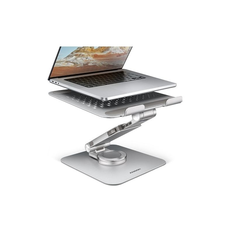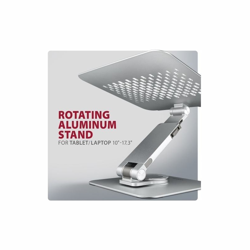 Aluminum stand with 360° rotation for laptops 10" - 17.3". Adjustable height and angle.