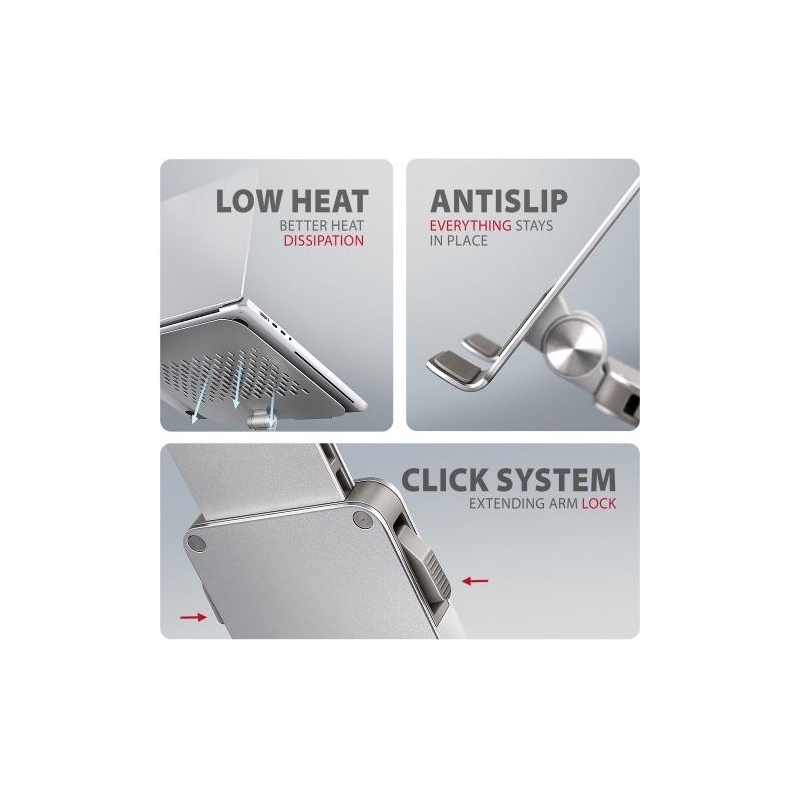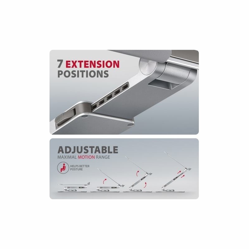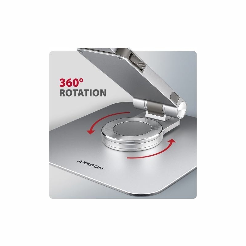 AXAGON STND-LR is a stand with 360° rotation, double hinge and extendable arm that provides maximum comfort and significantly improves ergonomics when working with a laptop or tablet. Designed for devices from 10" to 17.3", it allows you to adjust the ideal height and angle to relax your neck and back muscles. Thanks to its 360° mechanism and extendable arm, it adapts perfectly to your needs whether you are working at home, in the office or on the move. The compact and portable design of the stand ensures a comfortable working environment anywhere.