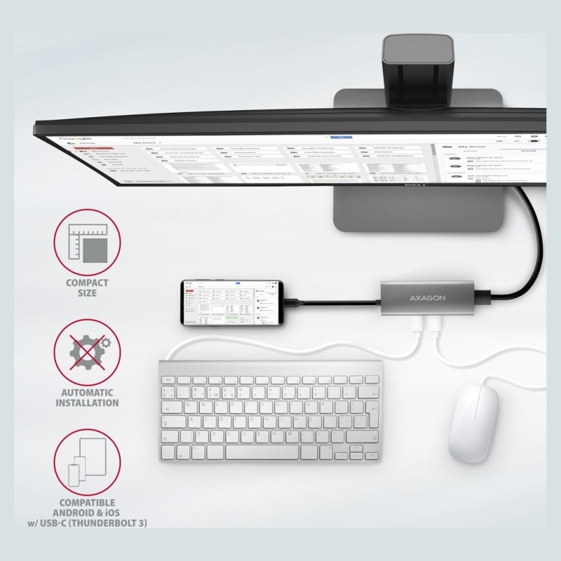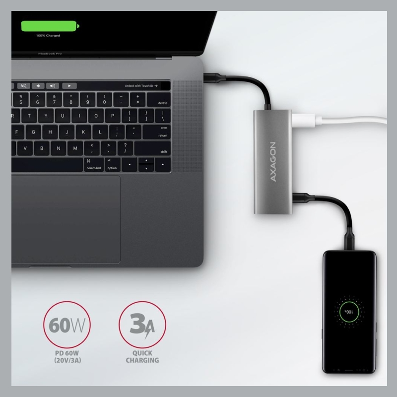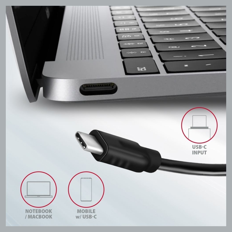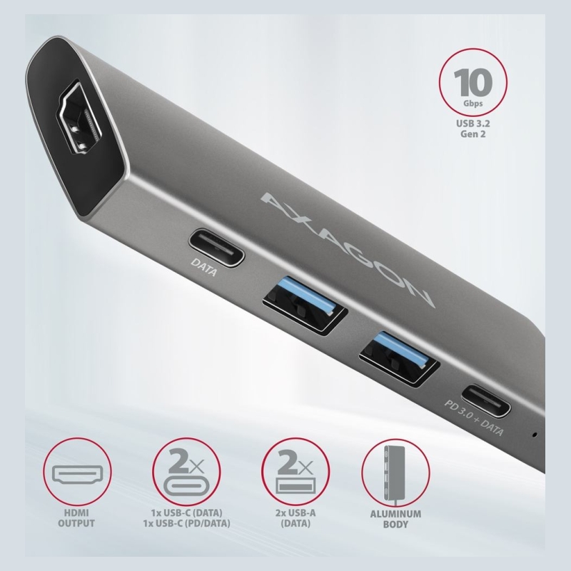 Multi-port USB-C 10Gbps hub. HDMI, 2× USB-A, USB-C, USB-C PD/DATA ports. 13 cm USB-C cable.