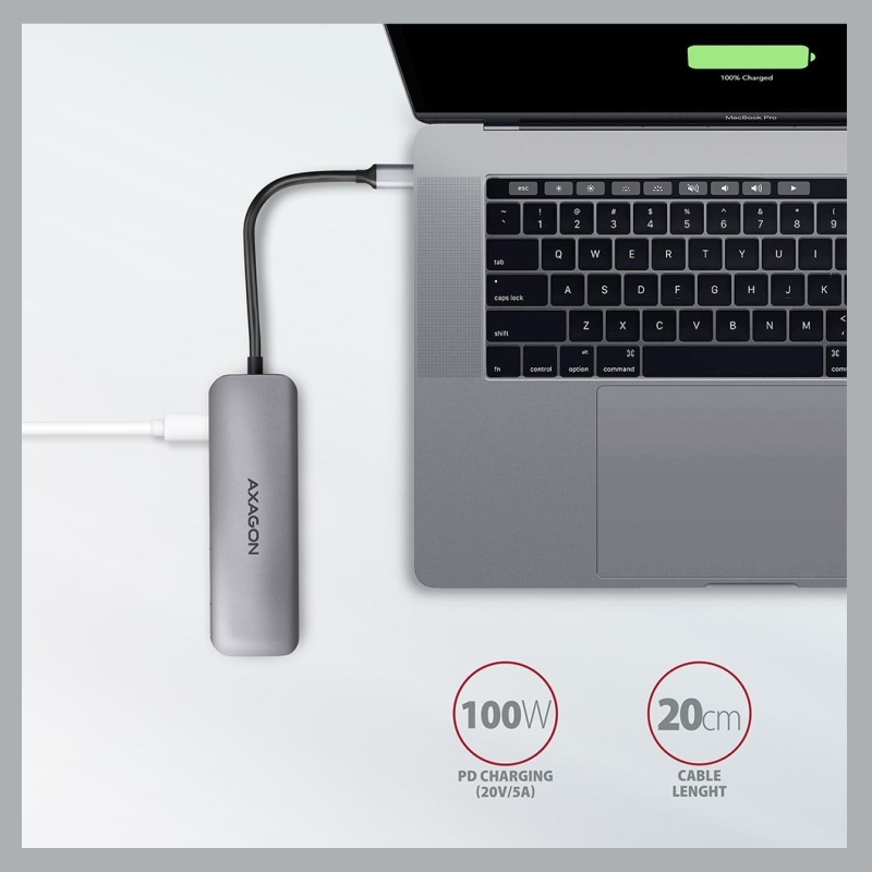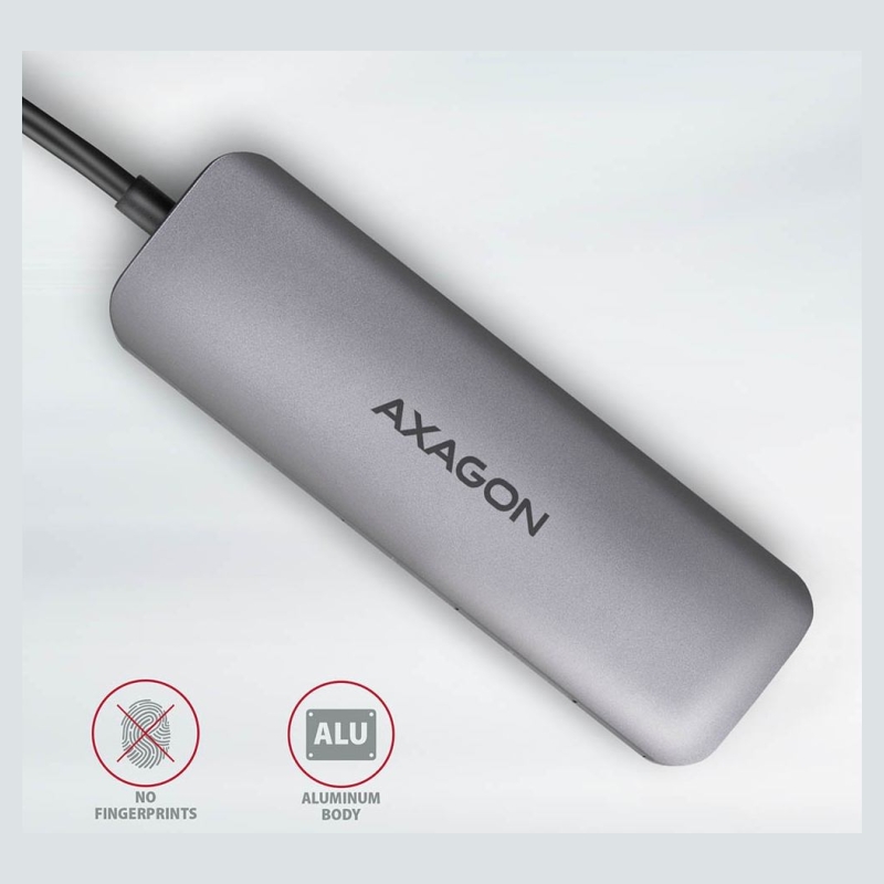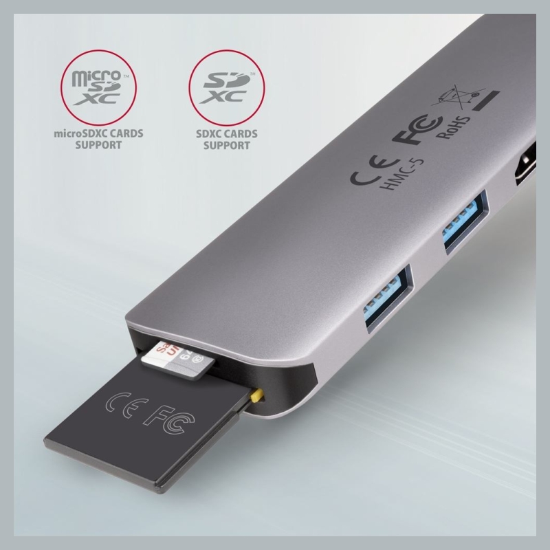 Multiport USB-C 3.2 Gen 1 hub AXAGON HMC-5 expands your laptop, computer or phone with four ports and SD / microSD card reader. You can easily and quickly connect up to two USB devices, card reader and HDMI display to your computer at the same time via the double-sided USB-C connector. You also get the possibility to supply laptop using Power Delivery technology at the same time. The USB-C hub will provide you with a simple and compact 5in1 docking station for notebook like MacBook Pro.