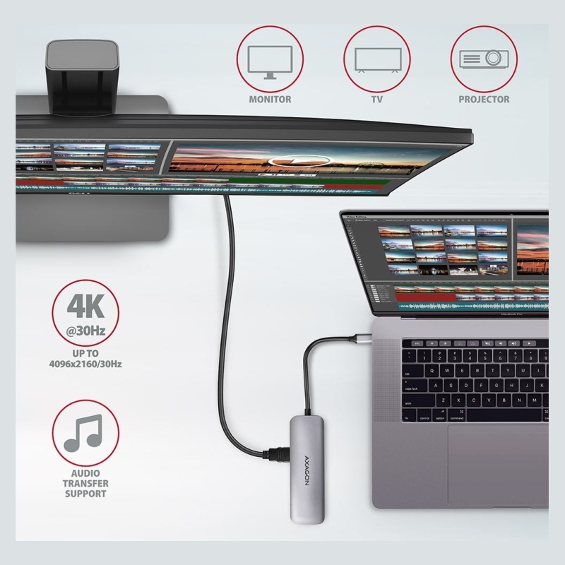 HDMI output provides high quality image up to 4K/30Hz Ultra HD resolution and supports multi-channel audio transmission. Popular gaming resolution WQHD 2560 x 1440px at 60Hz or FullHD 1920 x 1080px at 60, 100 and 120Hz max. are also supported. DisplayPort Alternate Mode (DP Alt Mode) enabled USB-C port or Thunderbolt 3 port is necessary for the proper function of video output.