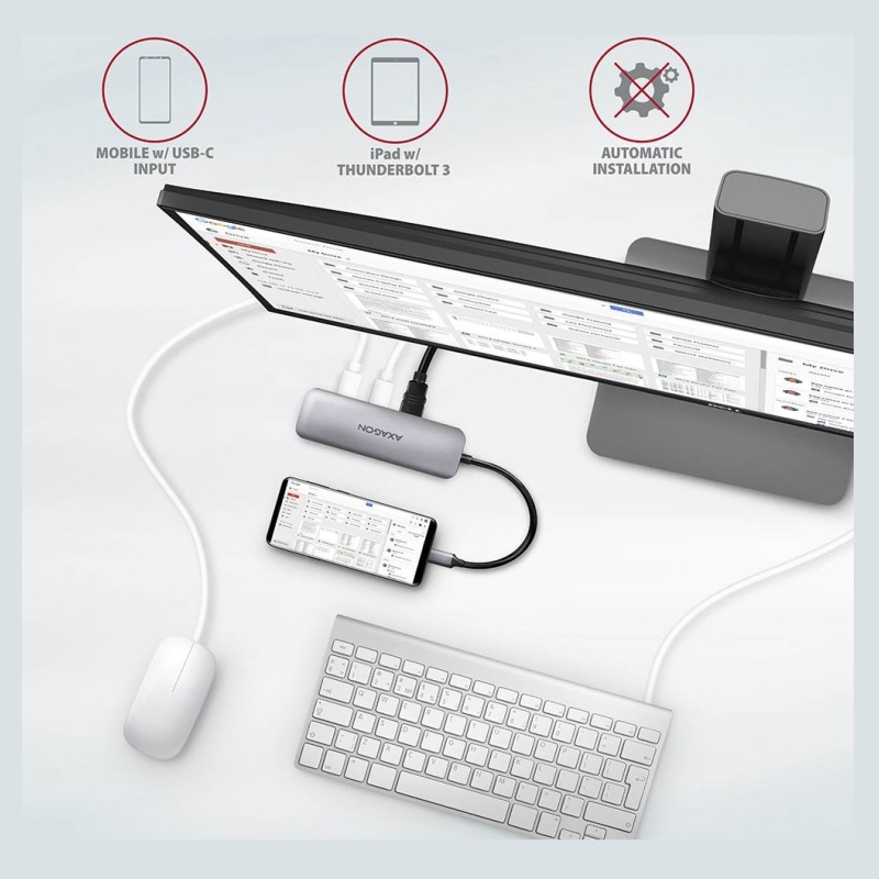 Port replicator is an ideal accessory for laptops without USB-A connectors, card reader and video output. You can use your current USB peripherals without having to purchase new ones. Thanks to the Plug and Play and Hot Plug functions, the connection of the hub is very simple without complicated installation. It is also possible to easily connect and disconnect peripherals while the computer is running. The hub does not afraid of connection to phones with a USB-C connector - for example, you can connect a flash drive, keyboard, mouse, display, TV or projector to the phone.