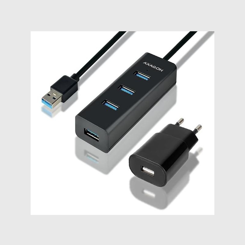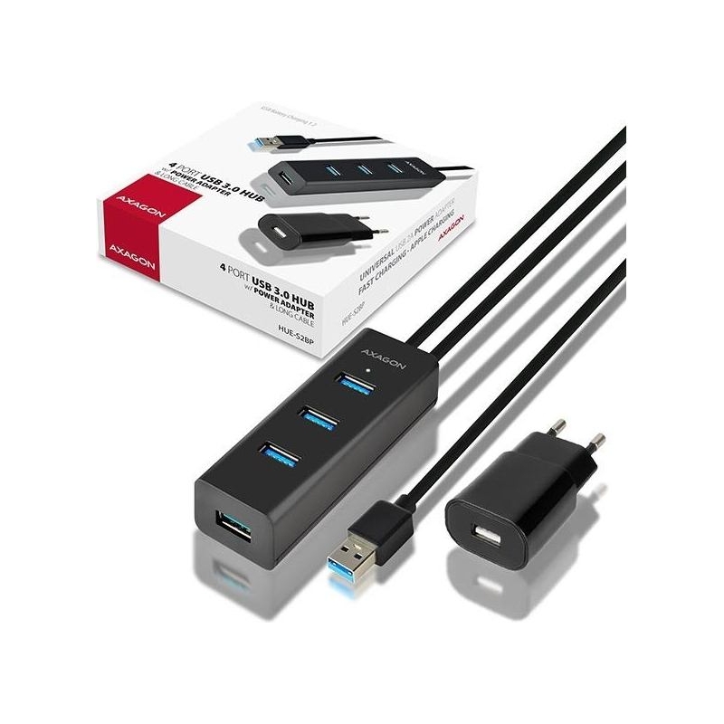 The four port AXAGON HUE-S2BP USB 3.0 hub with a 1.2 m long USB cable, power adapter and fast charging support on all ports.