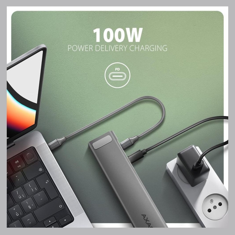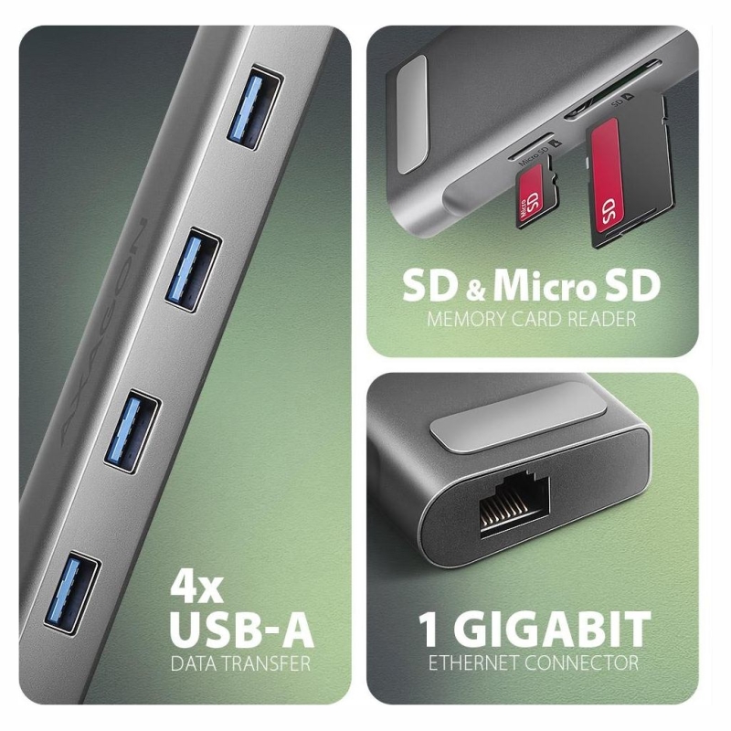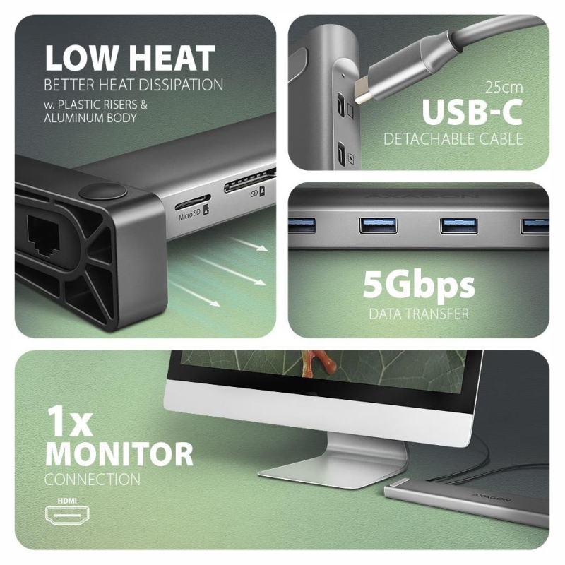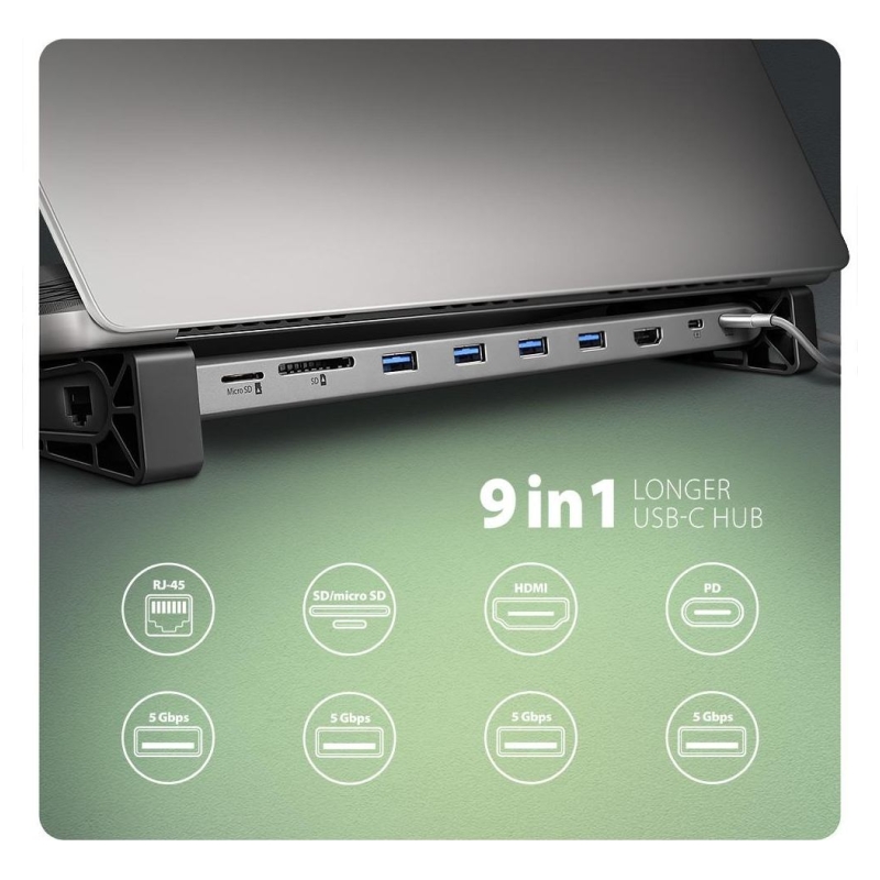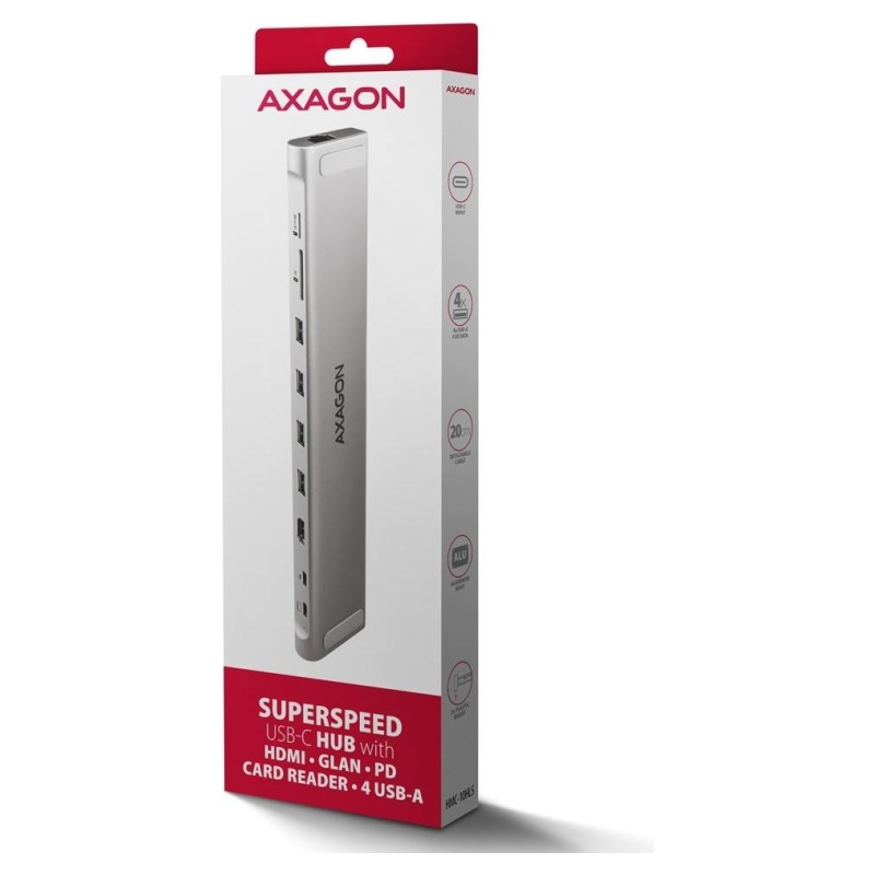 The multi-port USB-C 5Gbps AXAGON HMC-10HLS LONGER hub 9in1 expands your laptop, computer or phone with nine ports. You can easily and quickly connect a monitor, four USB devices, Gigabit Ethernet network and an SD card reader to your computer via the double-sided USB-C connector. You also get the possibility to supply laptop using Power Delivery technology at the same time. The port replicator will thus provide you with a simple and compact 9in1 docking station not only for Windows laptops but also for Apple laptops such as MacBook Air or MacBook Pro.