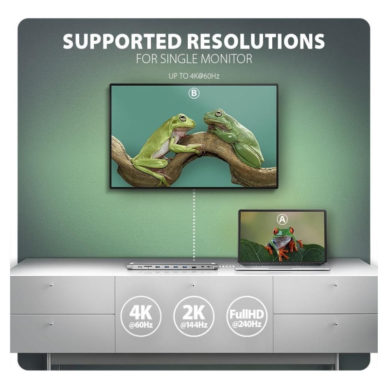 Thanks to the Plug and Play and Hot Plug functions, connecting the hub itself is very simple without complicated installation, and peripherals can also be easily connected and disconnected while the computer is running. The hub does not afraid of connection to phones with a USB-C connector. For example, you can connect a flash drive, keyboard, mouse, display, TV or projector to the phone.
