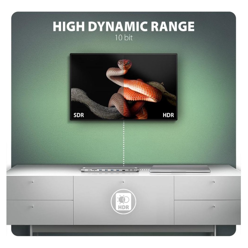 Thanks to HDR (high dynamic range) support, you can enjoy a significantly expanded range of colors and contrasts without restrictions. For video outputs to work properly, the laptop must have a USB-C port with DisplayPort Alternate Mode (DP Alt Mode) support or a Thunderbolt 3 port and above.