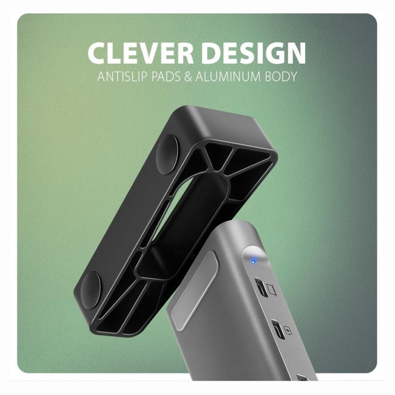 The elegant aluminum body ensures not only mechanical resistance, but also passive cooling. The package includes extensions that allow the hub to be used as a pad under the laptop, which will ensure better cooling thanks to greater airflow under the laptop. At the same time, it improves ergonomics at your workplace.