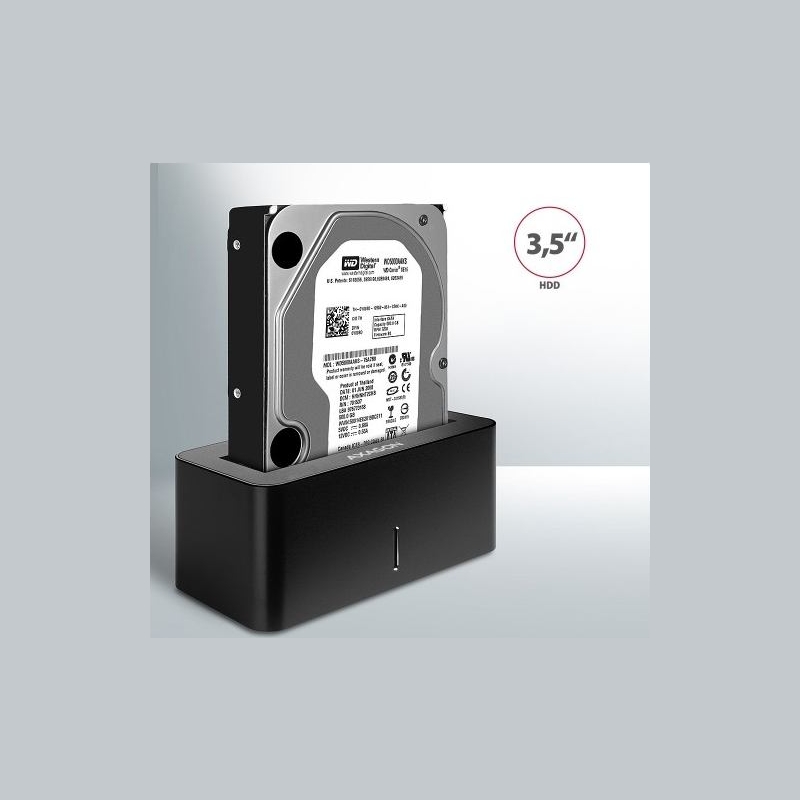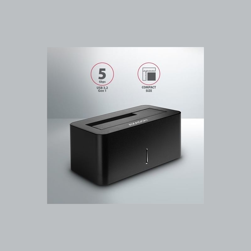 Compact USB 3.2 Gen 1 docking station for 2.5" and 3.5" SATA HDDs/SSDs.