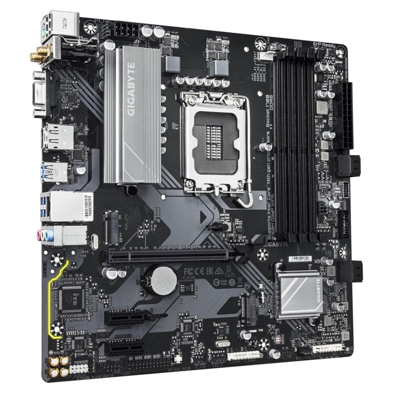 Supports Intel Core 14th/ 13th /12th processors Unparalleled Performance: Hybrid 4+1+1 Phases Digital VRM Solution Dual Channel DDR5: 4*DIMMs XMP Memory Module Support Next Generation Storage: 2*PCIe 4.0 x4 M.2 Connectors Fast Networks: GbE LAN & Wi-Fi 6 802.11ax Extended Connectivity: Front USB-C 5Gb/s, DP, HDMI, D-Sub Smart Fan 6: Features Multiple Temperature Sensors, Hybrid Fan Headers with FAN STOP Q-Flash Plus: Update BIOS Without Installing the CPU, Memory and Graphics Card Manufacturer Website: https://www.gigabyte.com/ Category Code MBI CnCode 84733020 Unit Box Height 0.07 Unit Box Length 0.275 Unit Box Width 0.27 Audio chip Realtek ALC897 Audio output channels 7.1 channels Component for PC Cooling type Passive Motherboard chipset Intel B760 Express Motherboard chipset family Intel Motherboard form factor micro ATX PC health monitoring Fan/Temperature/Voltage/Water cooling Power source type ATX Product colour Dark brown Windows operating systems supported Windows 10 x64/Windows 11 x64 Compatible processor series Intel Core/Intel Core i3 12th Gen/Intel Core i3 13th Gen/Intel Core i3 14th Gen/Intel Core i5 12th Gen/Intel Core i5 13th Gen/Intel Core i5 14th Gen/Intel Core i7 12th Gen/Intel Core i7 13th Gen/Intel Core i7 14th Gen/Intel Core i9 12th Gen/Intel® Celeron® Processor manufacturer Intel Processor socket LGA 1700 Supported processor sockets LGA 1700 ECC сompatibility ECC & Non-ECC Maximum internal memory 192 GB Maximum internal memory per slot 48 GB Memory channels Dual-channel Memory slots type DIMM Number of memory slots 4 Supported memory clock speed (max) 5600 MHz Supported memory clock speeds 4400/4800/5200/5600 MHz Supported memory types DDR5-SDRAM Unbuffered memory Yes Number of HDDs supported 4 Number of storage drives supported 6 RAID levels 0/1/10/5 RAID support Yes Supported storage drive interfaces M.2,PCI Express 4.0,SATA III Supported storage drive types HDD & SSD DirectX version 12.0 HDCP Yes Maximum resolution 4096 x 2304 pixels Parallel processing technology support Not supported 12V power connector Yes ATX Power connector (24-pin) Yes CPU fan connector Yes EPS power connector (8-pin) Yes Front panel audio connector Yes Front panel connector Yes Number of chassis fan connectors 3 Number of CPU fan connectors 1 Number of EPS power connectors (8-pin) 1 Number of RGB LED pin headers 2 Number of SATA III connectors 4 Parallel connector Yes RGB LED pin header Yes S/PDIF out connector Yes Serial port headers 1 TPM connector Yes USB 2.0 connectors 2 USB 3.2 Gen 1 (3.1 Gen 1) connectors 2 DisplayPort version 1.2 DisplayPorts quantity 1 Ethernet LAN (RJ-45) ports 1 HDMI ports quantity 1 HDMI version 2.1 Headphone outputs 1 Line-in Yes Microphone in Yes PS/2 ports quantity 1 USB 2.0 ports quantity 2 USB 3.2 Gen 1 (3.1 Gen 1) Type-A ports quantity 3 VGA (D-Sub) ports quantity 1 WiFi-AP antenna jack 2 Bluetooth Yes Bluetooth version 5.3 Ethernet interface type Gigabit Ethernet Ethernet LAN Yes LAN controller Realtek RTL8111H Top Wi-Fi standard Wi-Fi 6 (802.11ax) Wi-Fi Yes Wi-Fi standards Wi-Fi 6 (802.11ax) WLAN controller model Realtek RTL8851BE 1st M.2 highest PCI Express generation 4.0 1st M.2 largest key size 2280 2nd M.2 highest PCI Express generation 4.0 2nd M.2 largest key size 2280 Number of M.2 (M) slots 2 PCI Express x1 (Gen 3.x) slots 2 PCI Express x16 (Gen 4.x) slots 1 ACPI version 5.0 BIOS memory size 128 Mbit BIOS type UEFI AMI Clear CMOS jumper Yes Desktop Management Interface (DMI) version 2.7 System Management BIOS (SMBIOS) version 2.7 Battery technology Lithium-Manganese Dioxide (LiMnO2) Battery type CR2032 Battery weight 3 g Lithium weight per battery 0.07 g Number of battery cells 1 Package depth 265 mm Package height 54 mm Package weight 1200 g Package width 265 mm Products per shipping (inner) case 1 pc(s) Depth 244 mm Height 35 mm Width 244 mm Antenna included Yes Batteries included Yes Bundled software Norton® Internet Security (OEM version)