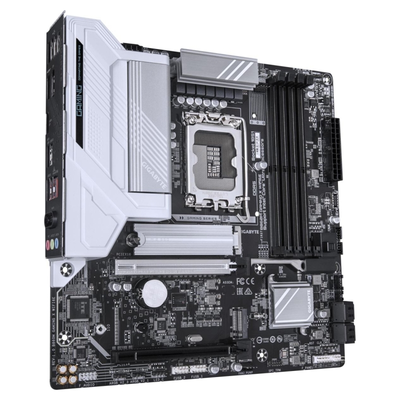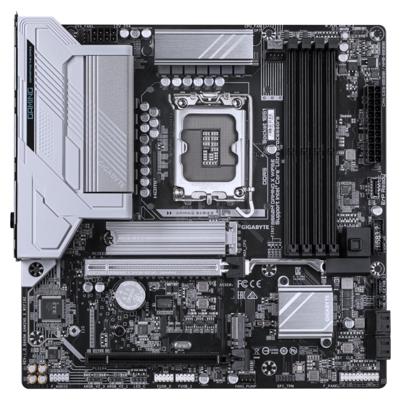 Hybrid Digital 8+1+2+2 Phases 60A DrMOS VRM Dual Channel DDR5:4*DIMMs PCIe 5.0 x16 with PCIE UD Slot & EZ-Latch Plus M.2 Thermal Guard with EZ-Latch Click Advanced MOSFET Heatsinks & PCH Heatsink Realtek 2x2 Wi-Fi 6E with WIFI EZ-Plug 2.5GbE LAN, USB 4.0 Type-C, USB 3.2 Gen 2 Type-C Q-Flash Plus Manufacturer Website: https://www.gigabyte.com/ Category Code MBI CnCode 84733020 Unit Box Height 0.07 Unit Box Length 0.27 Unit Box Width 0.275 Audio chip Realtek ALC897 Audio output channels 7.1 channels Component for PC Cooling type Passive Motherboard chipset Intel B860 Motherboard chipset family Intel Motherboard form factor micro ATX PC health monitoring Fan/Temperature/Voltage/Water cooling Power source type ATX Product colour Dark brown Windows operating systems supported Windows 11 x64 Compatible processor series Intel Core Ultra (Series 2)/Intel® Core™ Ultra (Series 1) Processor manufacturer Intel Processor socket LGA 1851 (Socket V1) Supported processor sockets LGA 1851 ECC сompatibility ECC & Non-ECC Maximum internal memory 256 GB Maximum internal memory per slot 64 GB Memory channels Dual-channel Memory slots type DIMM Number of memory slots 4 Supported memory clock speed (max) 9200 MHz Supported memory clock speeds 5600/6400/9200 MHz Supported memory types DDR5-SDRAM Unbuffered memory Yes Number of HDDs supported 4 Number of storage drives supported 6 RAID levels 0/1/10/5 RAID support Yes Supported storage drive interfaces M.2,SATA III Supported storage drive types HDD & SSD DirectX version 12.0 HDCP Yes Maximum resolution 4096 x 2160 pixels Parallel processing technology support Not supported ATX Power connector (24-pin) Yes CPU fan connector Yes EPS power connector (8-pin) Yes Front panel audio connector Yes Front panel connector Yes Number of chassis fan connectors 2 Number of CPU fan connectors 2 Number of EPS power connectors (8-pin) 1 Number of RGB LED pin headers 4 Number of SATA III connectors 4 Number of water pump connectors 2 RGB LED pin header Yes Thunderbolt headers 2 TPM connector Yes USB 2.0 connectors 2 USB 3.2 Gen 1 (3.1 Gen 1) connectors 1 USB 3.2 Gen 2 (3.1 Gen 2) connectors 1 DisplayPort version 2.1 DisplayPorts quantity 1 Ethernet LAN (RJ-45) ports 1 HDMI ports quantity 1 HDMI version 2.1 Headphone outputs 1 Line-in Yes Microphone in Yes USB 2.0 ports quantity 5 USB 3.2 Gen 1 (3.1 Gen 1) Type-A ports quantity 3 USB4 Gen 2x2 ports quantity 1 WiFi-AP antenna jack 2 Bluetooth Yes Bluetooth version 5.3 Ethernet interface type 2.5 Gigabit Ethernet Ethernet LAN Yes LAN controller Realtek RTL8125 Top Wi-Fi standard Wi-Fi 6E (802.11ax) Wi-Fi Yes Wi-Fi standards 802.11a/802.11b/802.11g/Wi-Fi 4 (802.11n)/Wi-Fi 5 (802.11ac)/Wi-Fi 6 (802.11ax)/Wi-Fi 6E (802.11ax) WLAN controller model Intel Wi-Fi 6E AX211 1st M.2 highest PCI Express generation 5.0 1st M.2 largest key size 2280 2nd M.2 highest PCI Express generation 4.0 2nd M.2 largest key size 25110 Number of M.2 (M) slots 2 PCI Express x16 (Gen 4.x) slots 1 PCI Express x16 (Gen 5.x) slots 1 ACPI version 5.0 BIOS memory size 256 Mbit BIOS type UEFI AMI Clear CMOS jumper Yes Desktop Management Interface (DMI) version 2.7 System Management BIOS (SMBIOS) version 2.7 Battery technology Lithium-Manganese Dioxide (LiMnO2) Battery type CR2032 Battery weight 3 g Country of origin China Lithium weight per battery 0.07 g Number of battery cells 1 Package depth 268 mm Package height 68 mm Package weight 1427.5 g Package width 270 mm Products per shipping (inner) case 1 pc(s) Depth 244 mm Height 35 mm Width 244 mm Antenna included Yes Batteries included Yes Bundled software Norton® Internet Security (OEM version)