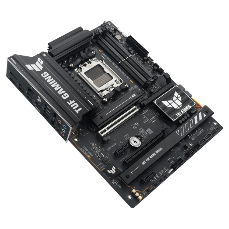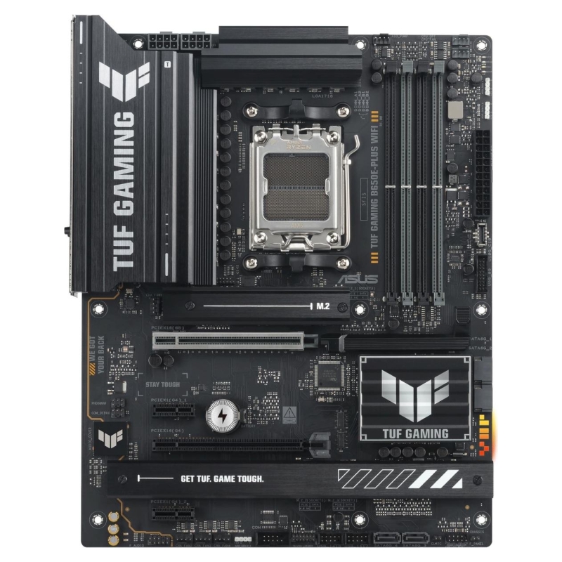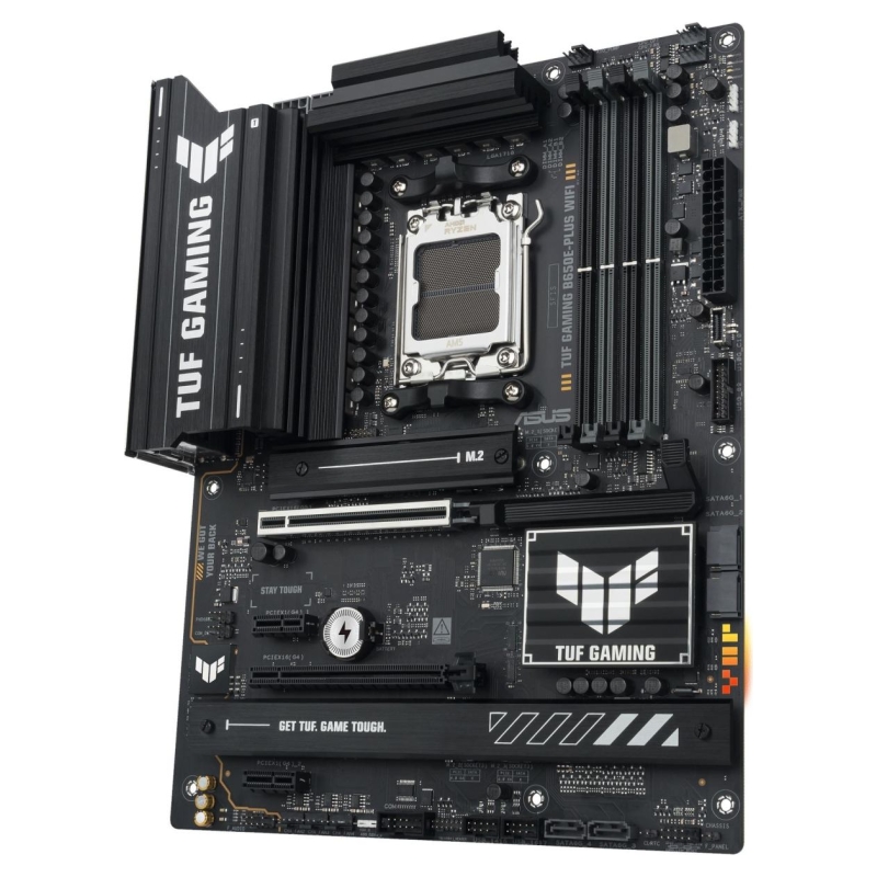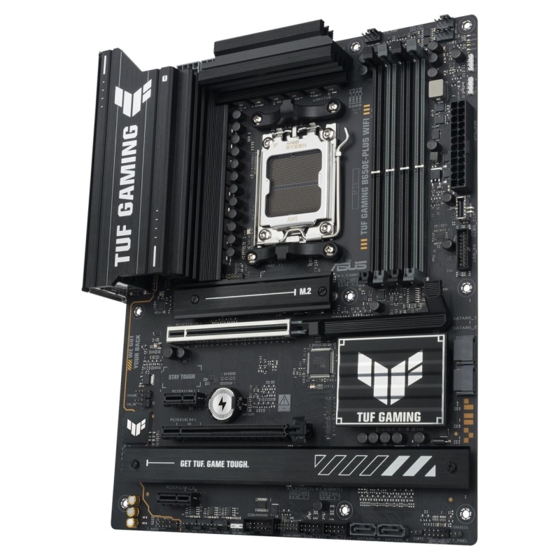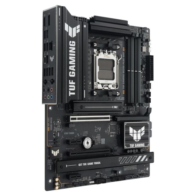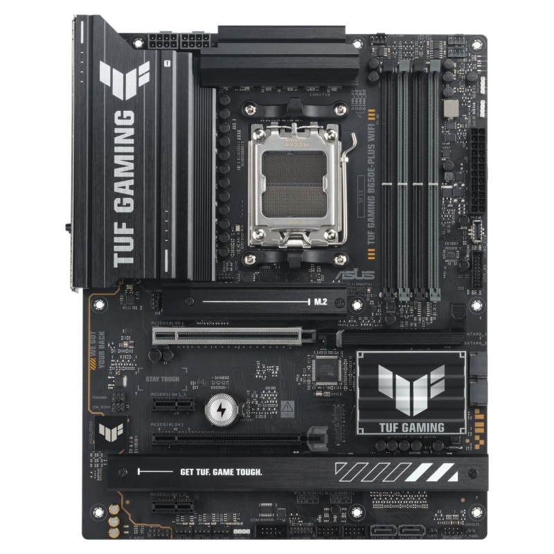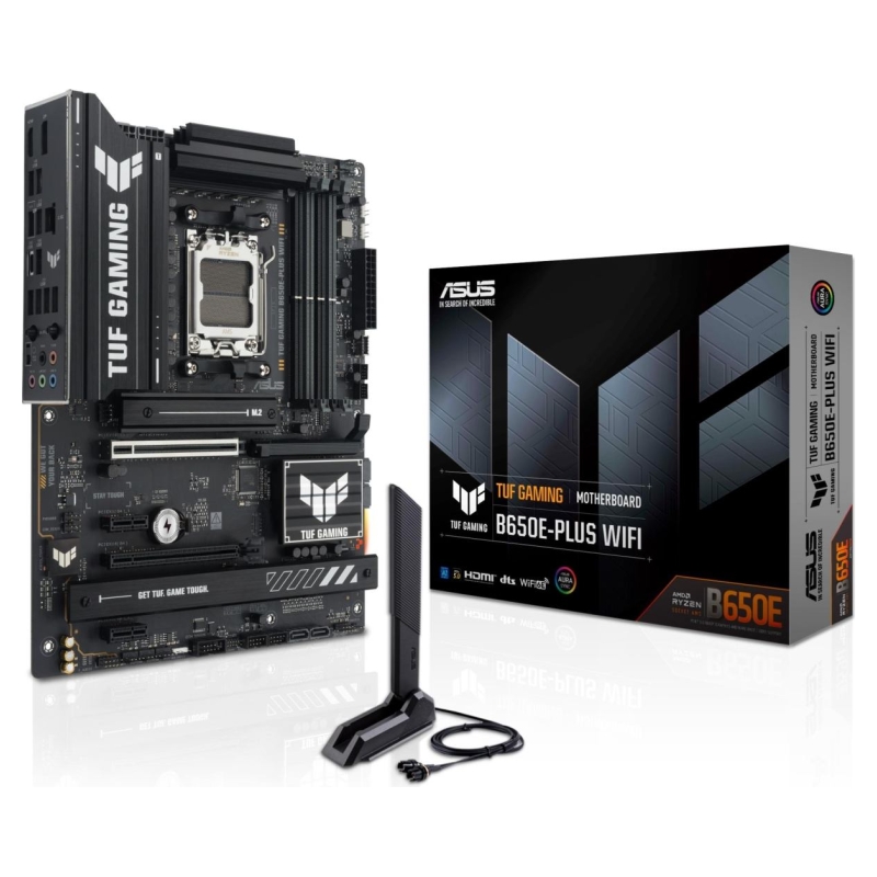 TUF GAMING B650E-PLUS WIFI ASUS TUF GAMING B650E-PLUS WIFI takes all the essential elements of the latest AM5 Socket for AMD Ryzen™ Desktop Processors and combines them with game-ready features and proven durability. Engineered with military-grade components, an upgraded power solution and a comprehensive cooling system, this motherboard goes beyond expectations with rock-solid and stable performance for marathon gaming. TUF GAMING motherboards also undergo rigorous endurance testing to ensure that they can handle conditions where others may fail. Aesthetically, this model incorporates rugged off-black and geometric design elements to reflect the dependability and stability that defines the TUF GAMING series. This platform delivers the power and connectivity that advanced AI PC applications demand.