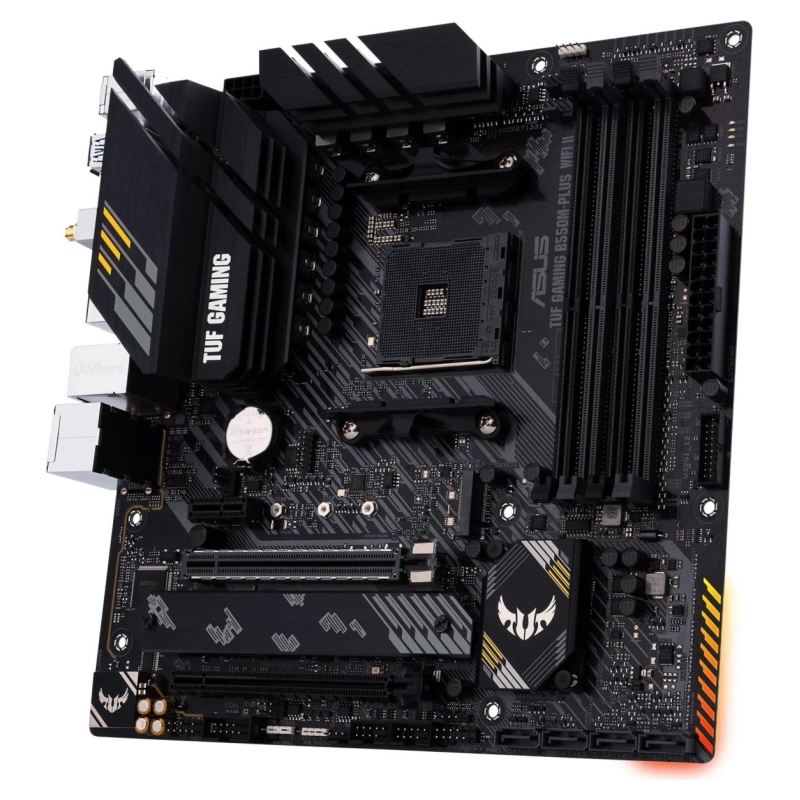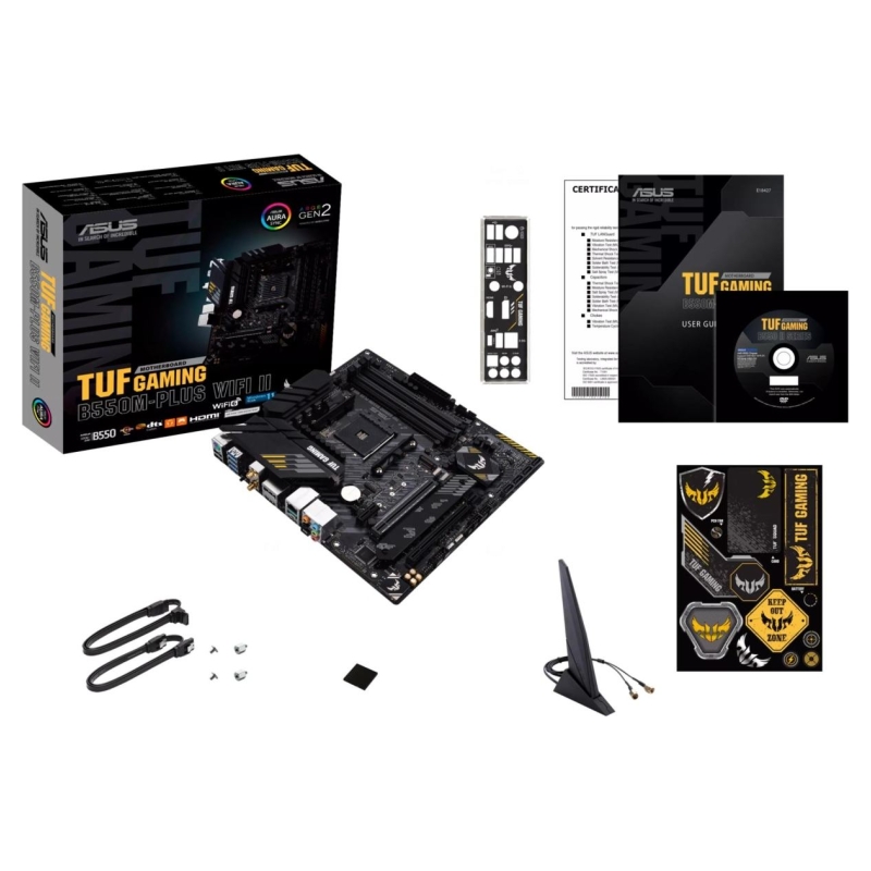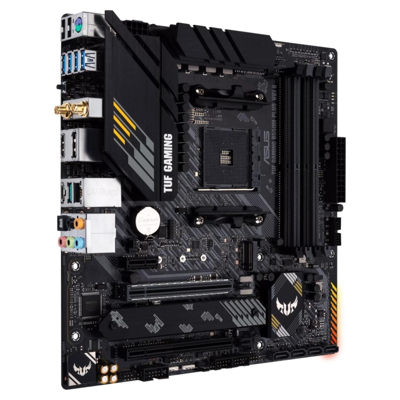 TUF Gaming B550M-Plus WIFI II provides a complete, high-performance gaming package with a long list of features to improve your experience, including ultrafast networking for smoother online gameplay, pristine audio with positional cues for FPS gaming, and onboard RGB lighting that syncs with attached accessories to help you create a personalized gaming atmosphere.