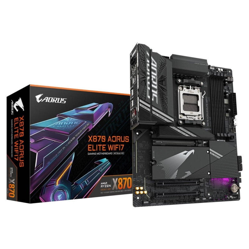 AMD Socket AM5: Supports AMD Ryzen 9000 Series, 8000 Series, 7000 Series Processors Twin 16+2+2 Phases Digital VRM with DrMOS Dual Channel DDR5:4*DIMMs with AMD EXPO™ Memory Module Support PCIe Gen5 x16 with PCIe UD Slot X & EZ-Latch Plus Ultra-Fast Storage: 4*M.2 slots, including 3* PCIe 5.0 x4 Efficient Overall Thermal: VRM Thermal Armor Advanced & M.2 Thermal Guard L Extended Connectivity: Dual USB4 Type-C with DP-Alt, HDMI Fast Networking: 2.5GbE LAN & Wi-Fi 7 with directional Ultra-high gain antenna Manufacturer Website: https://www.gigabyte.com/ Category Code MBA CnCode 84733020 Unit Box Height 0.27 Unit Box Length 0.34 Unit Box Width 0.08 Audio chip Realtek ALC1220 Audio output channels 7.1 channels Component for PC Motherboard chipset AMD X870 Motherboard chipset family AMD Motherboard form factor ATX PC health monitoring Fan/Temperature/Voltage Product colour Black Windows operating systems supported Windows 11 x64 Compatible processor series AMD Ryzen 7000 Series/AMD Ryzen 8000 Series/AMD Ryzen 9000 Series Maximum internal memory supported by processor 256 GB Processor manufacturer AMD Processor socket Socket AM5 Supported processor sockets Socket AM5 ECC сompatibility Non-ECC Maximum internal memory 256 GB Maximum internal memory per slot 64 GB Memory channels Dual-channel Memory slots type DIMM Number of memory slots 4 Supported memory clock speed (max) 8200 MHz Supported memory clock speeds 4400/4800/5200/5600/6000/6200/6400/6600/6666/6800/7000/7200/7600/7800/8000/8200 MHz Supported memory module capacities 16GB/1GB/24GB/2GB/32GB/4GB/8GB Supported memory types DDR5-SDRAM Number of HDDs supported 4 Number of storage drives supported 8 RAID levels 0/1/10 RAID support Yes Supported storage drive interfaces M.2,SATA III Supported storage drive types HDD & SSD DirectX version 12.0 On-board graphics card No Parallel processing technology support Not supported ATX Power connector (24-pin) Yes CPU fan connector Yes EPS power connector (8-pin) Yes Front panel audio connector Yes Front panel connector Yes Number of chassis fan connectors 6 Number of CPU fan connectors 2 Number of EPS power connectors (8-pin) 2 Number of RGB LED pin headers 4 Number of SATA III connectors 4 Number of water pump connectors 3 RGB LED pin header Yes TPM connector Yes USB 2.0 connectors 2 USB 3.2 Gen 1 (3.1 Gen 1) connectors 1 USB 3.2 Gen 2x2 connectors 1 DisplayPort version 1.4 DisplayPorts quantity 2 Ethernet LAN (RJ-45) ports 1 HDMI ports quantity 1 HDMI version 2.1 Headphone outputs 1 Microphone in Yes S/PDIF out port Yes USB 2.0 ports quantity 2 USB 3.2 Gen 1 (3.1 Gen 1) Type-A ports quantity 4 USB 3.2 Gen 2 (3.1 Gen 2) Type-A ports quantity 3 USB4 Gen 2x2 ports quantity 2 WiFi-AP antenna jack 2 Bluetooth Yes Bluetooth version 5.4 Ethernet interface type 2.5 Gigabit Ethernet Ethernet LAN Yes LAN controller Realtek RTL8125 Top Wi-Fi standard Wi-Fi 7 (802.11be) Wi-Fi Yes Wi-Fi standards Wi-Fi 7 (802.11be) WLAN controller model MediaTek MT7925 1st M.2 highest PCI Express generation 5.0 1st M.2 largest key size 25110 2nd M.2 highest PCI Express generation 5.0 2nd M.2 largest key size 22110 3rd M.2 highest PCI Express generation 5.0 3rd M.2 largest key size 22110 4th M.2 highest PCI Express generation 4.0 4th M.2 largest key size 22110 Number of M.2 (M) slots 4 PCI Express x16 (Gen 3.x) slots 1 PCI Express x16 (Gen 4.x) slots 1 PCI Express x16 (Gen 5.x) slots 1 PCI Express x4 slots 2 ACPI version 5.0 BIOS memory size 256 Mbit BIOS type UEFI AMI Clear CMOS button Yes Clear CMOS jumper Yes Desktop Management Interface (DMI) version 2.7 System Management BIOS (SMBIOS) version 2.7 Battery technology Lithium-Manganese Dioxide (LiMnO2) Battery type CR2032 Battery weight 3 g Country of origin China Lithium weight per battery 0.07 g Number of battery cells 1 Package depth 270 mm Package height 80 mm Package weight 2740 g Package width 335 mm Products per shipping (inner) case 1 pc(s) Depth 244 mm Height 35 mm Width 305 mm Antenna included Yes Batteries included Yes Bundled software Norton® Internet Security (OEM version)