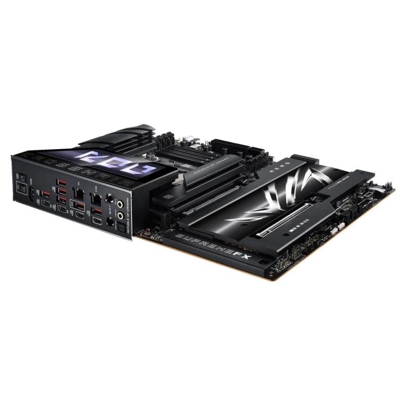 Manufacturer Website: https://rog.asus.com/motherboards/rog-crosshair/rog-crosshair-x870e-hero/ Category Code MBA CnCode 84733020 Unit Box Height 0.115 Unit Box Length 0.375 Unit Box Width 0.315 Audio chip Realtek ALC4082 Audio output channels 7.1 channels Component for PC Motherboard chipset AMD X870E Motherboard chipset family AMD Motherboard form factor ATX Windows operating systems supported Windows 11 Processor manufacturer AMD Processor socket Socket AM5 Supported processor sockets Socket AM5 ECC сompatibility ECC & Non-ECC Maximum internal memory 192 GB Memory channels Dual-channel Memory slots type DIMM Number of memory slots 4 Supported memory types DDR5-SDRAM Unbuffered memory Yes Number of HDDs supported 5 Number of storage drives supported 10 RAID levels 0/1/10/5 RAID support Yes Supported storage drive interfaces M.2,SATA III,SlimSAS Supported storage drive types HDD & SSD Parallel processing technology support Not supported 12V power connector Yes ATX Power connector (24-pin) Yes CPU fan connector Yes EPS power connector (8-pin) Yes Front panel audio connector Yes Number of chassis fan connectors 4 Number of SATA III connectors 4 USB 2.0 connectors 2 USB 3.2 Gen 1 (3.1 Gen 1) connectors 2 USB 3.2 Gen 2x2 connectors 2 Ethernet LAN (RJ-45) ports 2 HDMI ports quantity 1 Headphone outputs 1 Microphone in Yes S/PDIF out port Yes USB 3.2 Gen 2 (3.1 Gen 2) Type-A ports quantity 6 USB 3.2 Gen 2 (3.1 Gen 2) Type-C ports quantity 2 USB4 Gen 2x2 ports quantity 2 WiFi-AP antenna jack 1 Bluetooth Yes Bluetooth version 5.4 Ethernet interface type 2.5 Gigabit Ethernet/5 Gigabit Ethernet Ethernet LAN Yes Top Wi-Fi standard Wi-Fi 7 (802.11be) Wi-Fi Yes Wi-Fi standards Wi-Fi 7 (802.11be) Number of M.2 (M) slots 5 PCI Express x16 (Gen 4.x) slots 4 PCI Express x16 (Gen 5.x) slots 2 BIOS memory size 256 Mbit BIOS type UEFI AMI Clear CMOS button Yes Package depth 312 mm Package height 108 mm Package weight 4265 g Package width 370 mm Depth 244 mm Height 50 mm Width 305 mm Cables included SATA Drivers included Yes Weight 2546 g Model ROG CROSSHAIR X870E HERO Units per Shipping Box 4 Unit Calculated Volume 0.01483 cubm Unit Calculated Weight 4.31 kg