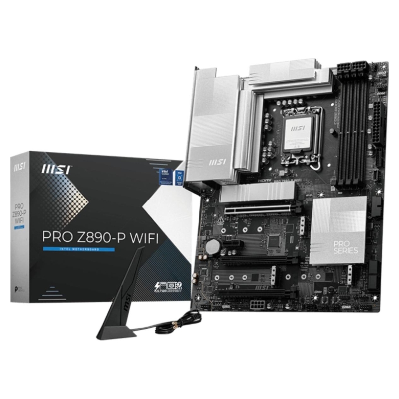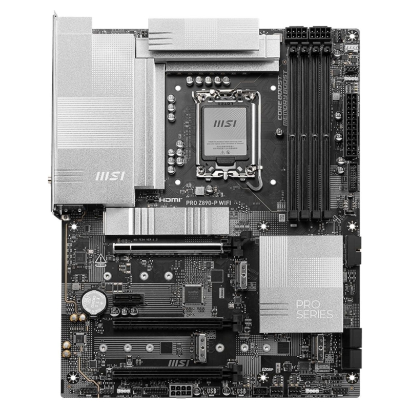 PRO Z890-P WIFI offers a simple design with a harmonious silver color scheme that perfectly matches both white and black PC builds. It is engineered with many exclusive features of MSI, a true Wi-Fi 7 with EZ Antenna, 5G LAN, Thunderbolt 4, PCIe 5.0 M.2 with EZ M.2 Shield Frozr II, and Supplemental PCIe Power, ready for the Intel® Core™ Ultra processors.
