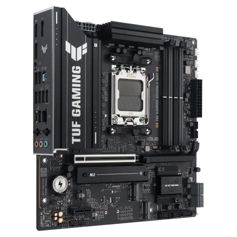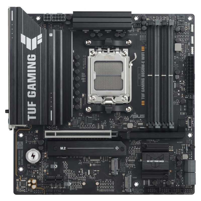 ASUS TUF GAMING B850M-E WIFI takes all the essential elements of the latest AMD Ryzen™ processors and combines them with game-ready features and proven durability. Engineered with military-grade components, an upgraded power solution and a comprehensive cooling system, this motherboard goes beyond expectations with rock-solid and stable performance for marathon gaming. TUF GAMING motherboards also undergo rigorous endurance testing to ensure that they can handle conditions where others may fail. This platform delivers the power and connectivity that advanced AI PC applications demand.