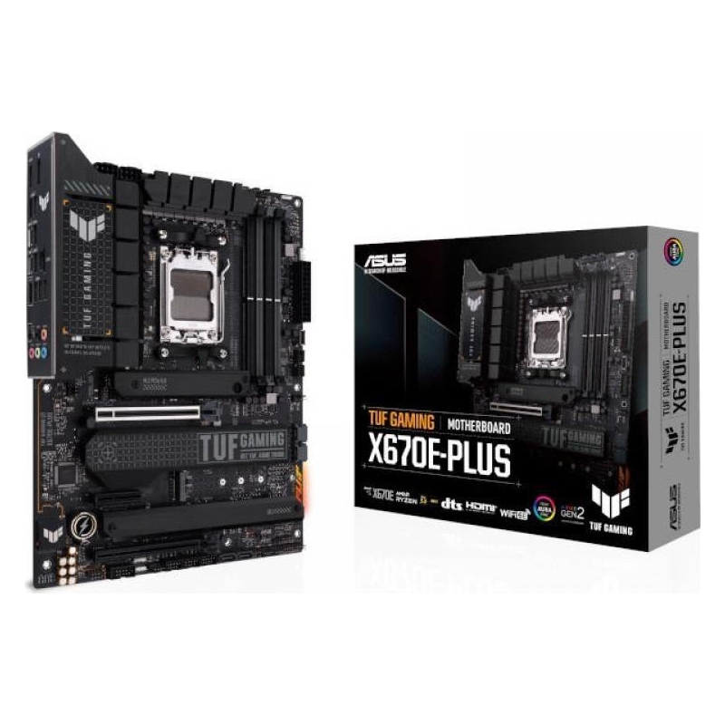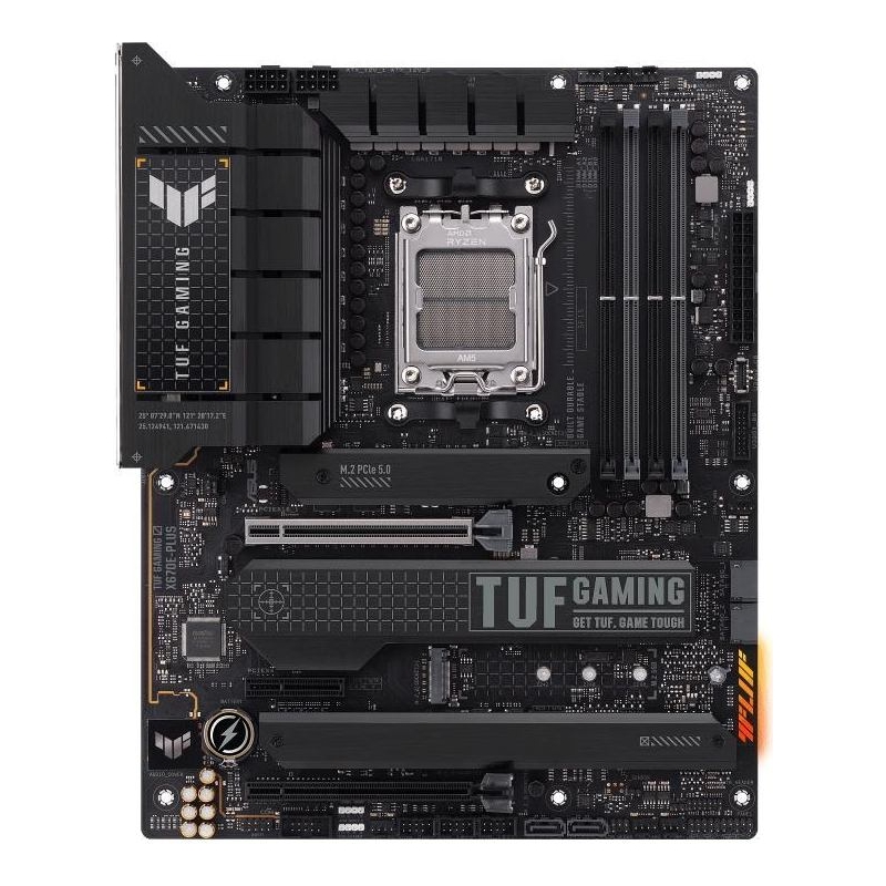 ASUS TUF GAMING X670E-PLUS takes all the essential elements of the latest AMD Ryzen 7000-series processors and combines them with game-ready features and proven durability. Engineered with military-grade components, an upgraded power solution and a comprehensive cooling system, this motherboard goes beyond expectations with rock-solid and stable performance for marathon gaming. TUF GAMING motherboards also undergo rigorous endurance testing to ensure that they can handle conditions where others may fail. Aesthetically, this model incorporates rugged off-black and geometric design elements to reflect the dependability and stability that defines the TUF GAMING series.