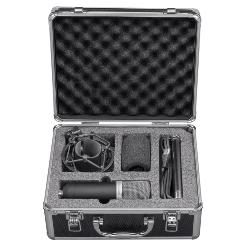 Professional USB studio microphone in flightcase, with high precision cardioid recording pattern; for streaming, podcasting, voice-overs and acoustic music