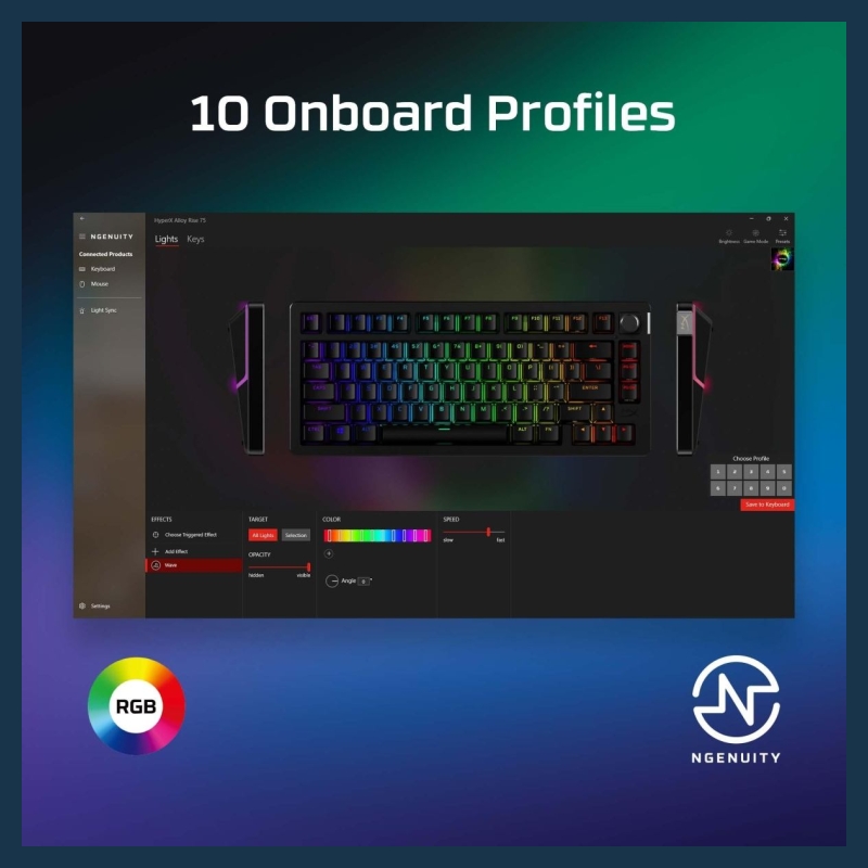 As the world's most customizable toolless mechanical gaming keyboard on the market5, the HyperX Alloy Rise 75 takes personalization to the next level. Not only can you hot-swap in key switches, but also magnetic top plates, badges, and more. All that customization is built onto its compact, solid frame and ultra-responsive 8k polling rate, giving you rapid keypress detection and more room. Out of the box, this keyboard features pre-lubed HyperX Linear Switches rated for up to 80 million keypresses1 as well as pre-installed HyperX PBT Keycaps. The 75% form factor is a great balance between compactness and function, providing dedicated arrow keys, navigation keys, and F keys. You’ll also get an upgraded RGB experience courtesy of the ambient light sensor that auto-adjusts the brightness, 10 keyboard profiles saved directly to the keyboard, and powerful customization via HyperX NGENUITY Software. Get one step closer to your endgame with the HyperX Alloy Rise 75.