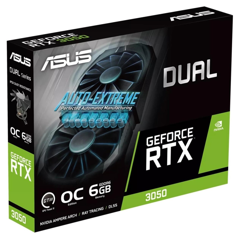 Featuring the latest NVIDIA® Ampere architecture, ASUS Dual GeForce RTX™ 3050 6G fuses dynamic thermal performance with broad compatibility. Advanced cooling solutions from flagship graphics cards are packed into the 20 cm long, 2-slot card, delivering more power in less space. These enhancements make ASUS Dual the perfect choice for gamers who want heavyweight graphics performance in a compact build.