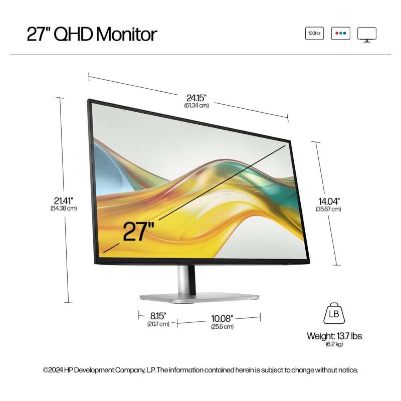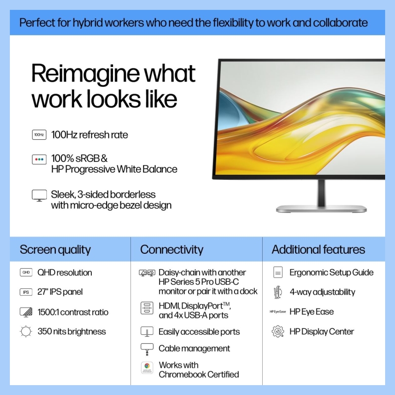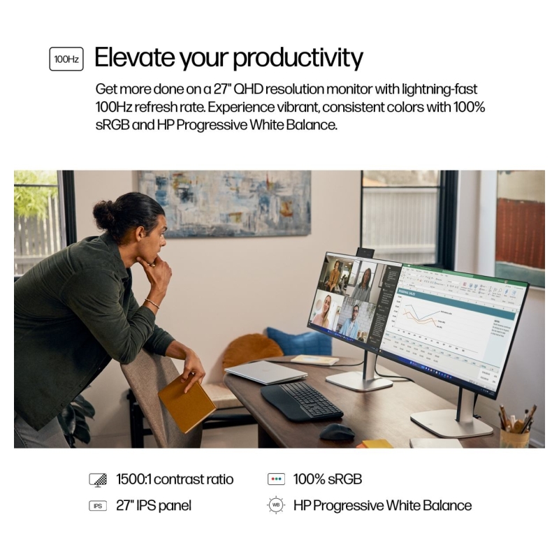 • Get more done on this 27" QHD resolution monitor with 100 Hz refresh rate[1]. Experience vibrant, consistent colors with 100% sRGB[1] and HP Progressive White Balance.[2]