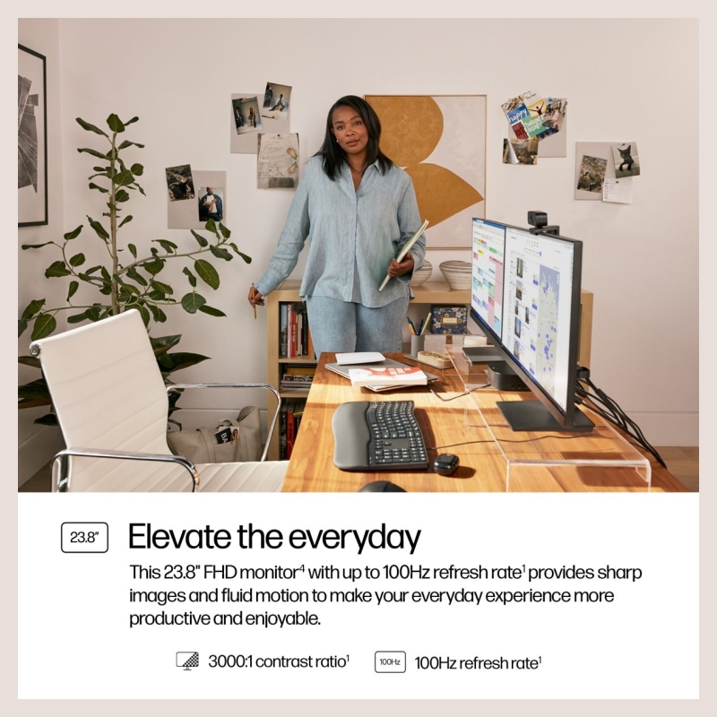• This 23.8" FHD monitor with up to 100Hz refresh rate[1] provides sharp images and fluid motion to make your everyday experience more productive and enjoyable.