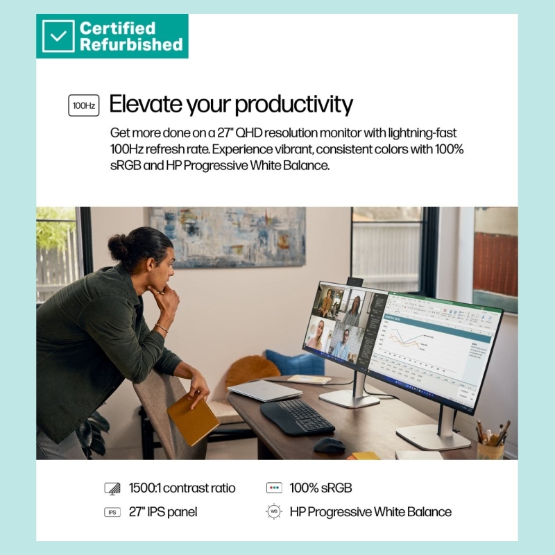 • Get more done on this 27" QHD resolution monitor with 100 Hz refresh rate[1]. Experience vibrant, consistent colors with 100% sRGB[1] and HP Progressive White Balance.[2]