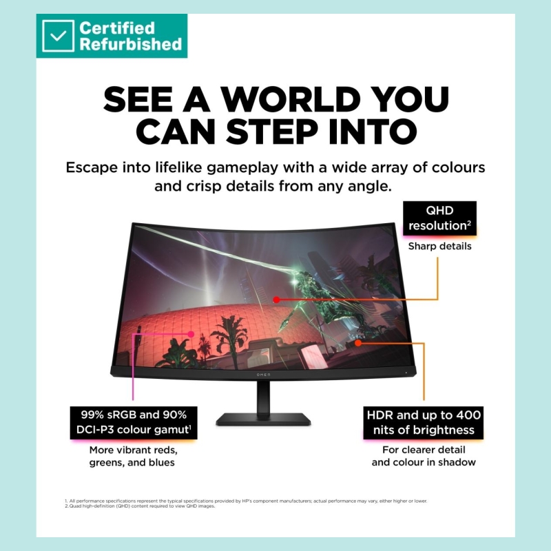 HP RENEW GOLD OMEN by HP 32c Curved Gaming Monitor - 31.5" 2560x1440 QHD 400-nit 165Hz AG, Curved, VA HDR 400, 2x HDMI/DisplayPo