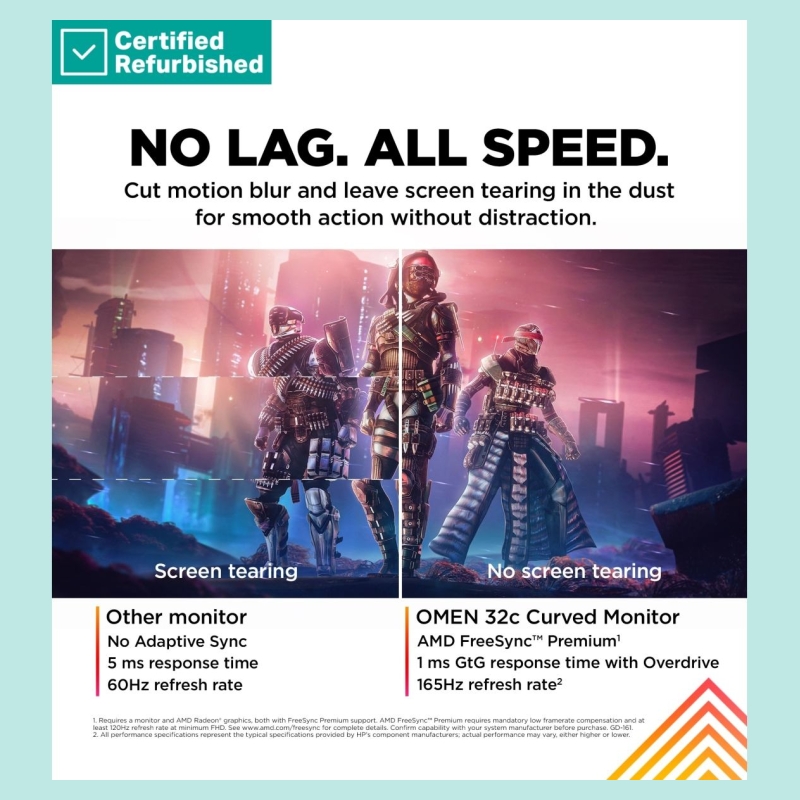 • Frame by frame, experience all the action with 1ms GTG response time with Overdrive and 165Hz refresh rate coupled with AMD FreeSync™ Premium technology[2].