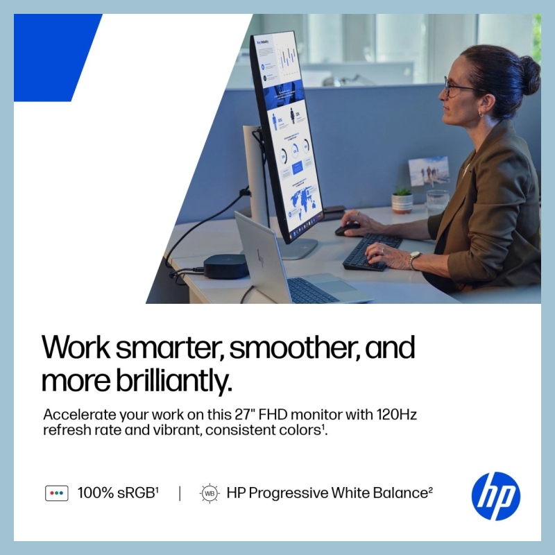• Accelerate your work on this 27" FHD monitor with 120Hz refresh rate[1] . Experience vibrant, consistent colors with 100% sRGB[1] and HP Progressive White Balance[2].