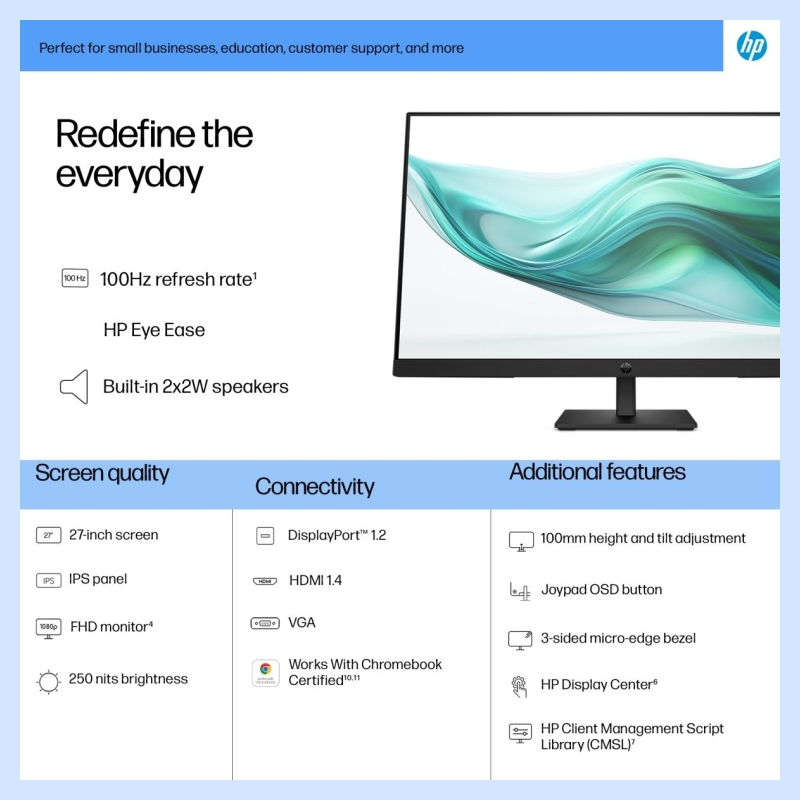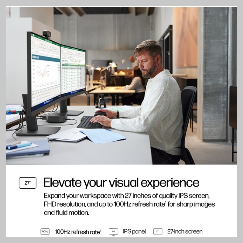 • Expand your workspace with 27 inches of quality IPS screen, FHD resolution, and up to 100 Hz refresh rate[1] for sharp images and fluid motion.
