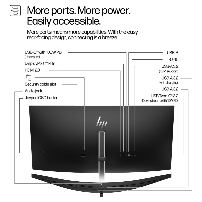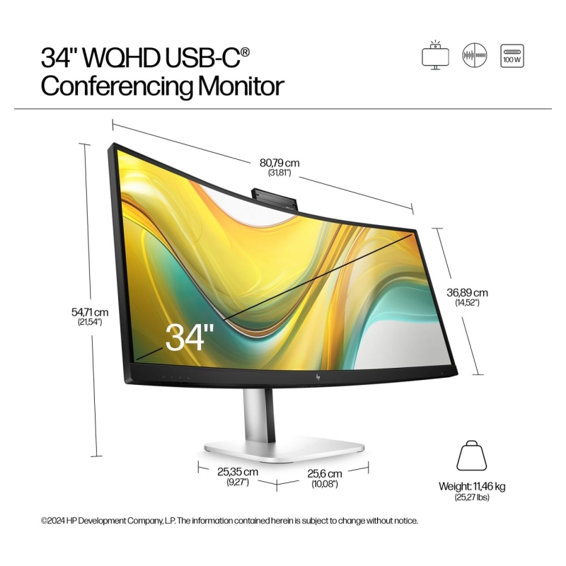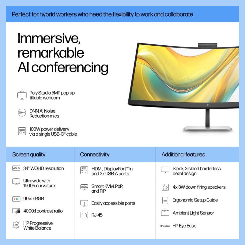HP 534pm Series 5 Pro WQHD USB-C Curved Conferencing PVC Free Monitor - 34" 3440x1440 WQHD 400-nit AG, VA, USB-C(100W/15W)/HDMI/DisplayPort, 3x USB-A, speakers, 5MP webcam, RJ-45 LAN, height adjustable/tilt/swivel, 3 years (replaces E34m)