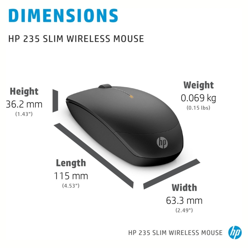 • Handle any task with this durable mouse that's built for comfort. Designed and tested to provide long-lasting comfort, the HP 235 Slim Wireless Mouse meets both requirements with ease.