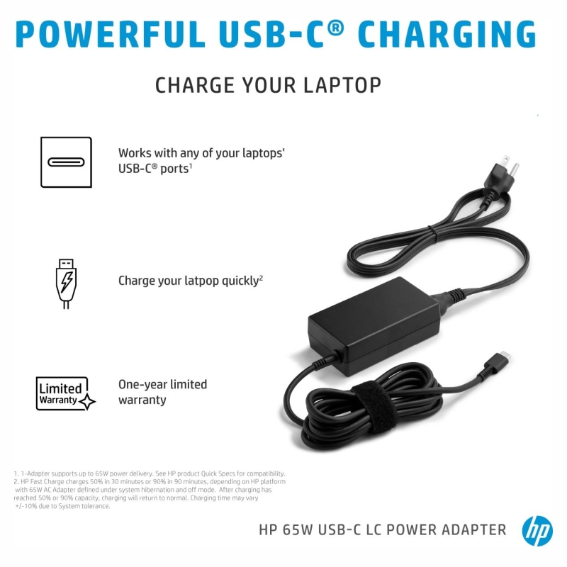 HP 65W USB-C Brick AC LC Power Adapter Notebook Charger / fits ProBook 430 440 450 G6 G7 G8 G9, EliteBook 830 840 850 G6 G7 G8 G9, x360 1030 1040 G6 G8 G9, Dragonfly