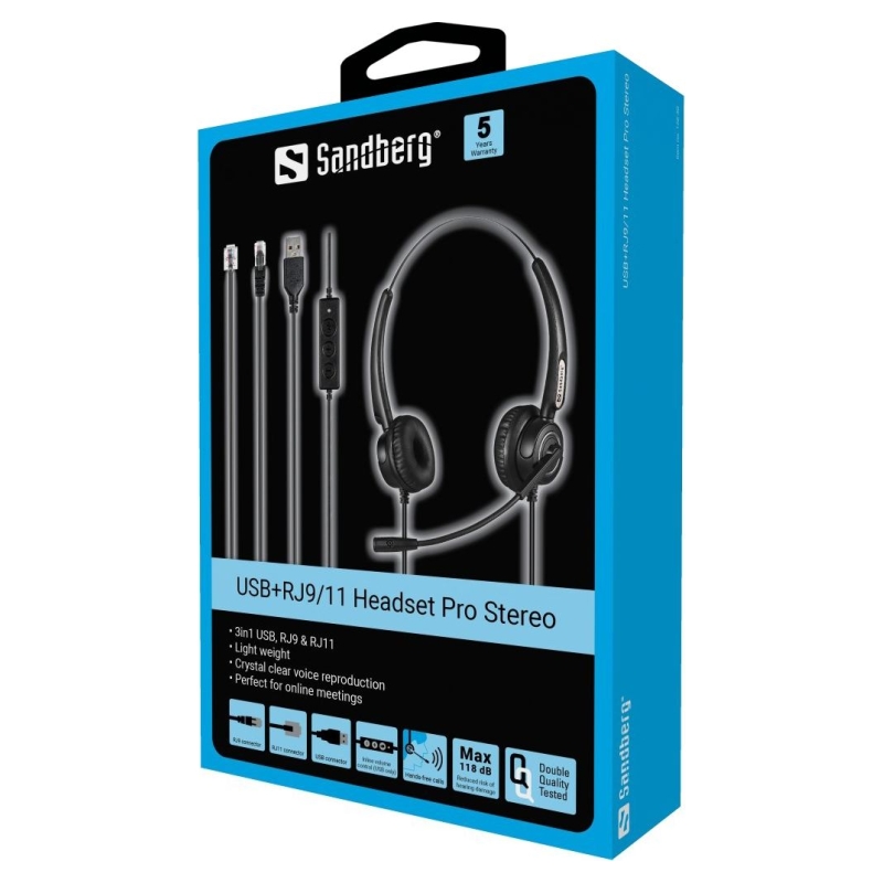 The Sandberg USB+RJ9/11 Office Headset Pro Stereo is of outstanding quality and can be used for, e.g. your home office, workplace or studying. The microphone is on a flexible arm, which ensures that the other person can hear you clearly. A speaker for each ear also means that reproduction of the other person's speech is clear and distinct. The discreet lightweight construction with soft ear pads and adjustable headband provides you with optimal comfort. Built-in max. volume of 118 db to avoid damage to your hearing. Connects through a USB, RJ9 or RJ11 port and works immediately.