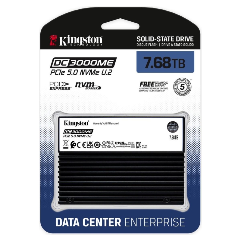 Kingston’s DC3000ME U.2 data center SSD features a high-speed PCIe 5.0 NVMe interface and utilizes 3D eTLC NAND, making it well suited for a wide range of server applications such as AI, HPC, OLTP, databases, cloud infrastructure and edge computing. DC3000ME includes on-board power loss protection to safeguard data in the event of sudden power loss and AES 256-bit encryption for ultimate data security. DC3000ME utilizes the latest high-speed PCIe 5.0 interface and is backward-compatible with PCIe 4.0 servers and backplanes. Like all of Kingston’s data center SSDs, DC3000ME is designed to deliver I/O consistency and low latency as the key design criteria that system integrators, hyperscale data centers and cloud service providers can depend on. DC3000ME is offered in 3.84TB, 7.68TB, 15.36TB and 30.72TB* capacities and is backed by Kingston's legendary technical support and a 5-year limited warranty.