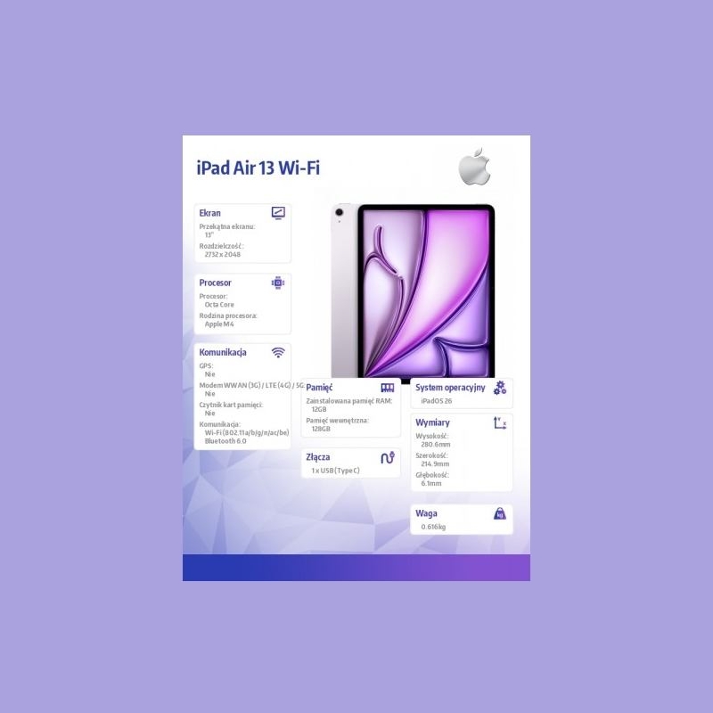 Īss ieskats Jauns APPLE Apple IPAD AIR 11 WIFI 128GB PUR 834,03 € Pievienot grozam wishlist compare Availability: 30 In Stock